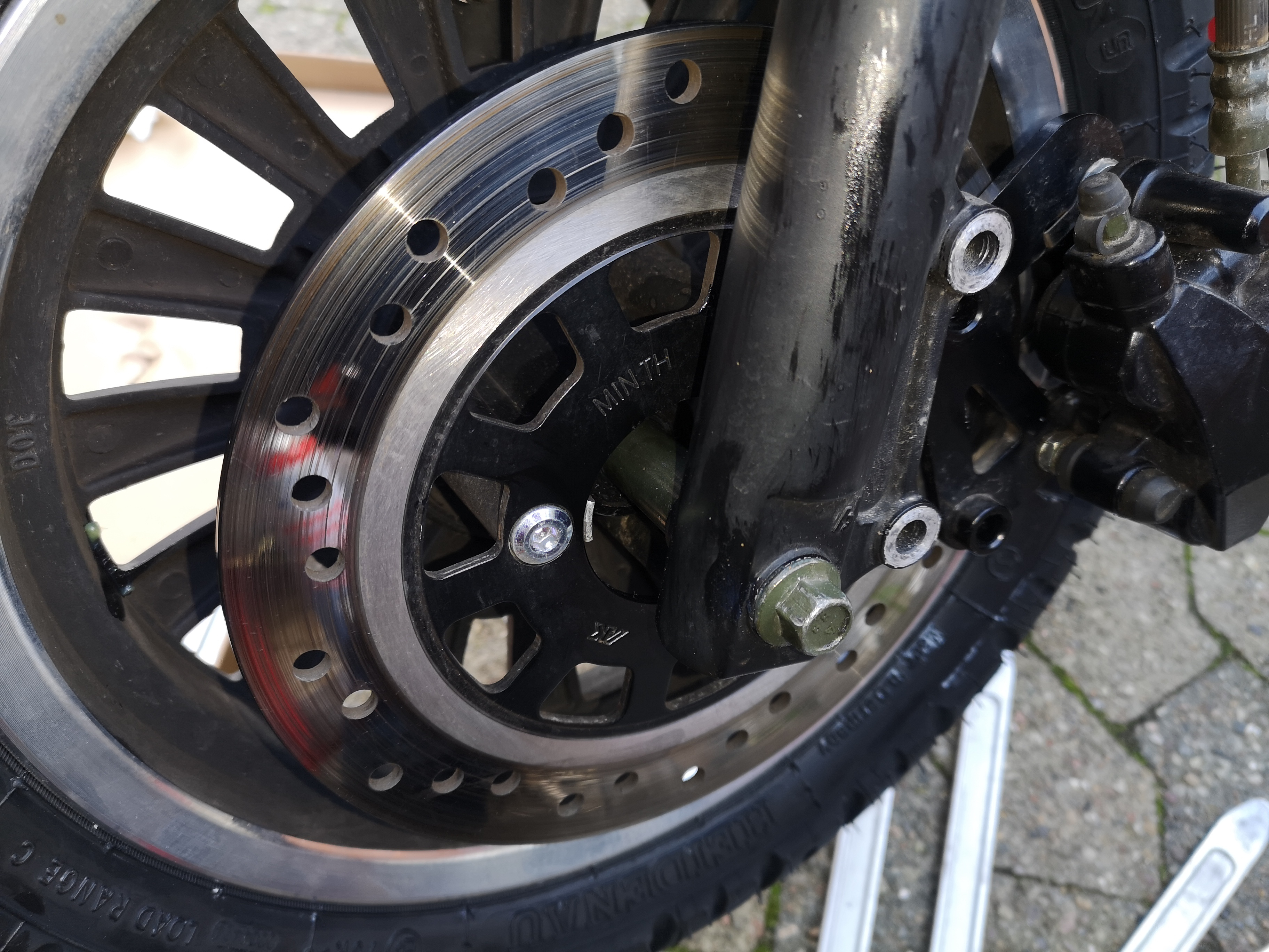 2. Die Vorderradbremse funktioniert ja ziemlich gut, fast schon bissig. Allerdings sah die Scheibe so aus, als hätte sie schon Riefen.