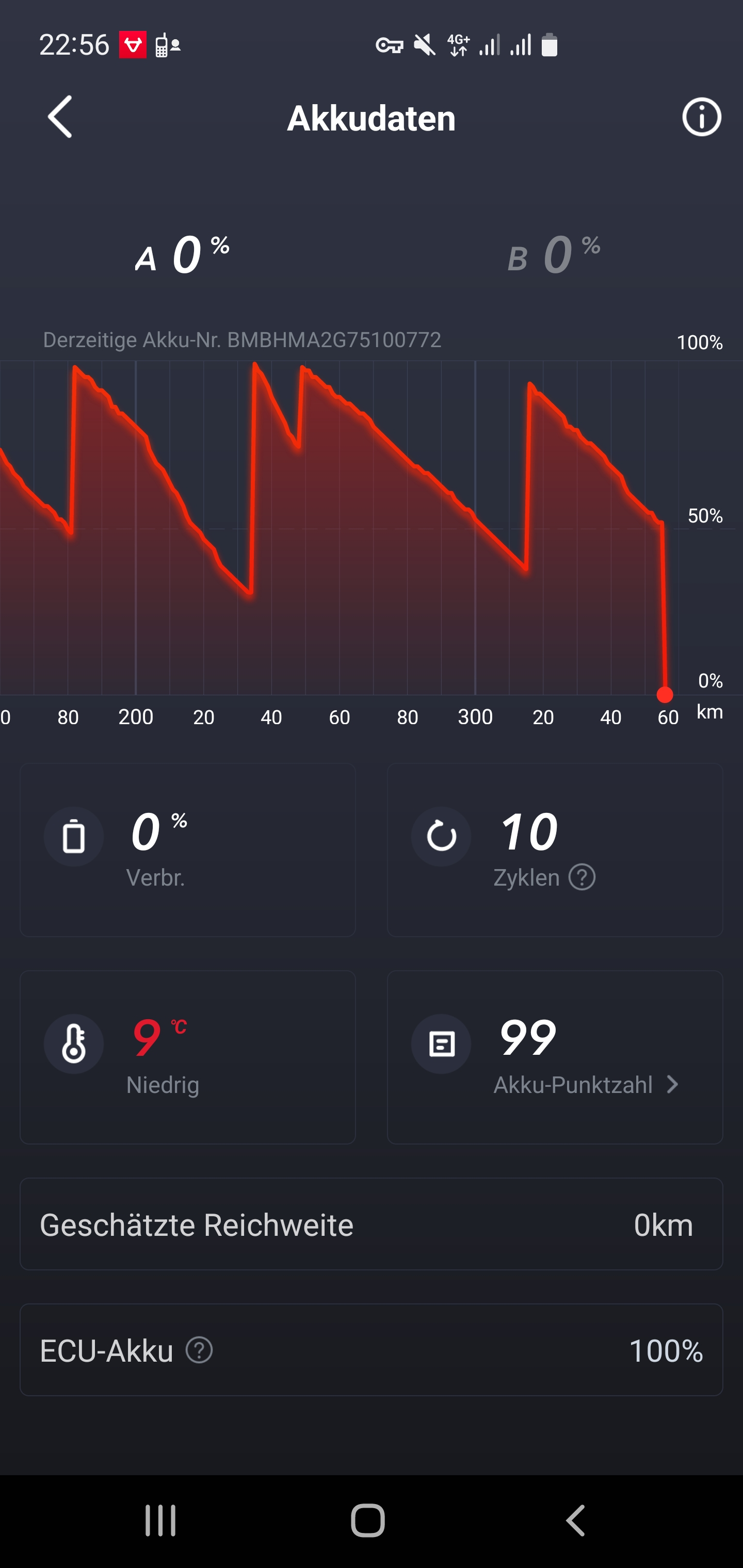 Regelmäßig in der App den Batteriezustand gecheckt. Vor zwei Tagen hatte Akku A noch 48%, Akku B noch 44%.