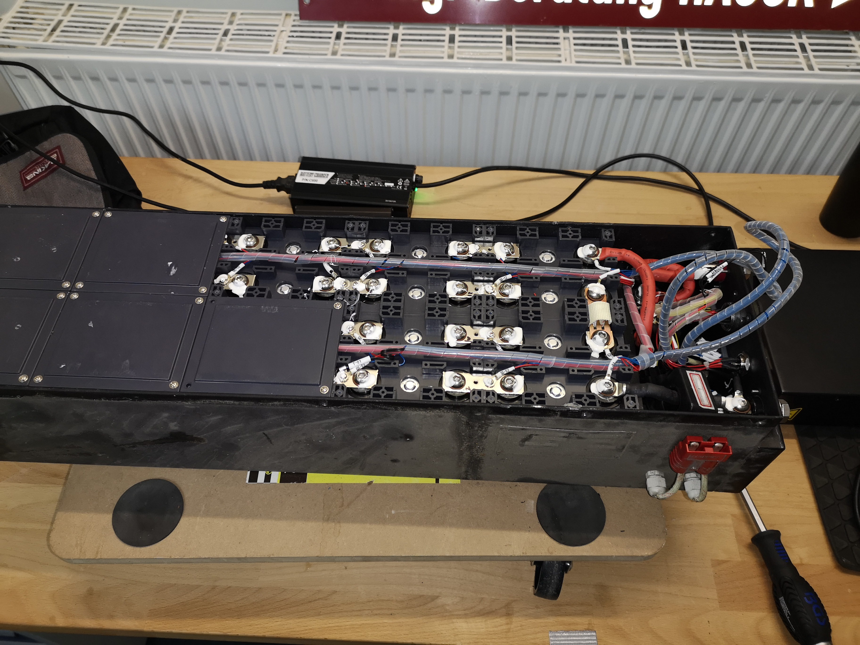 Im Sommer war der Roller bei Trinity in Meinersen. Da wurde der Akku wohl händisch ausbalanciert. Der riesige Akku hat eine Multibuchse, über die man an alle Zellen kommt.