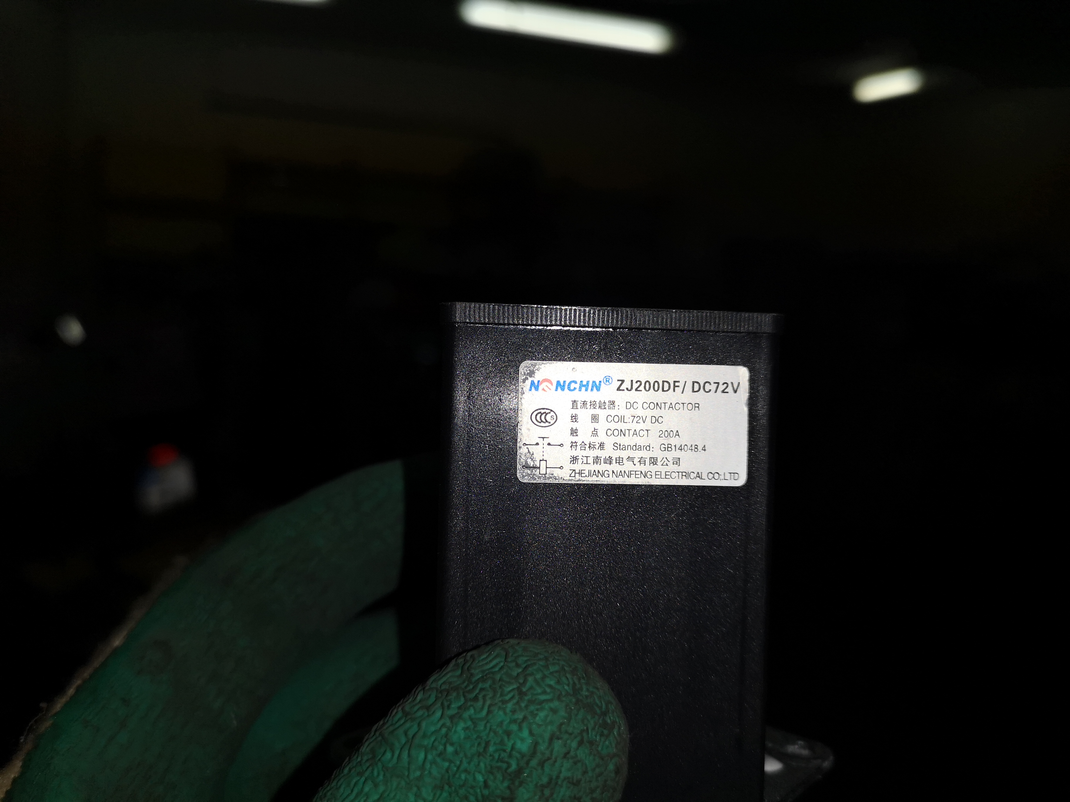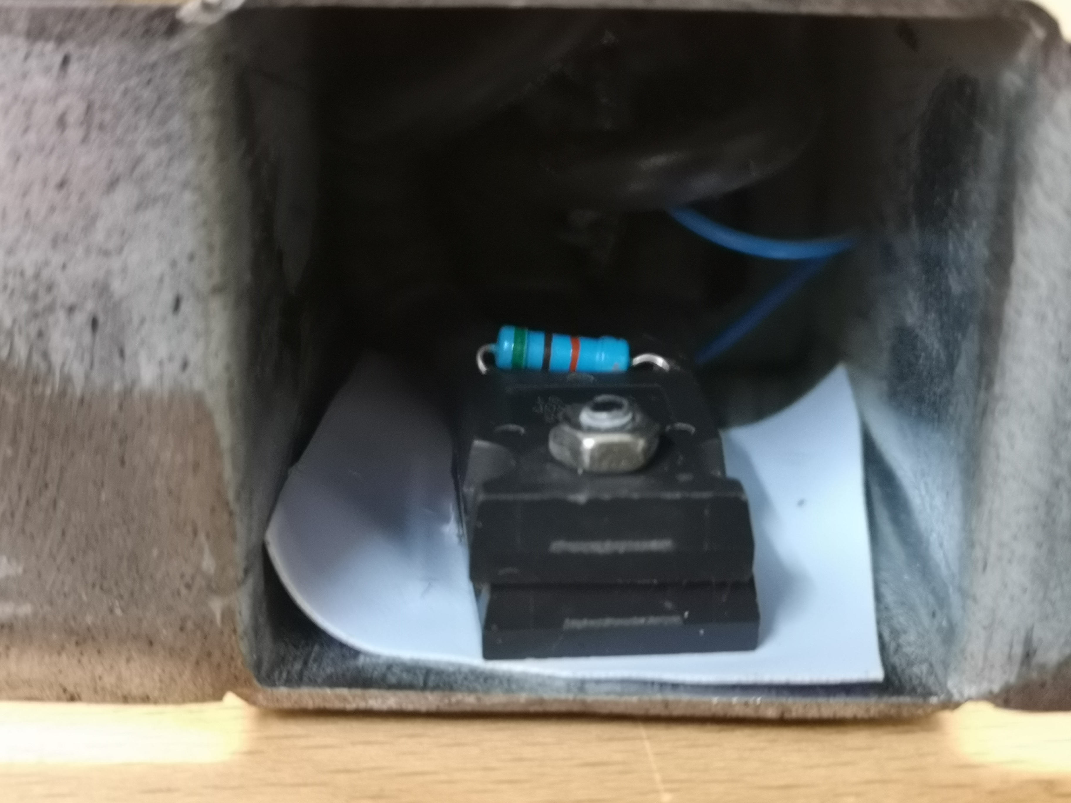 Es gibt ein Extrafach mit einer Art Verteilung. Der Pluspol läuft über einen Schütz, den Trinity unter Verdacht hatte. Der Schütz spricht bei 32 Volt (mehr gibt das Netzteil nicht her) schlapp an, scheint aber zu funktionieren.