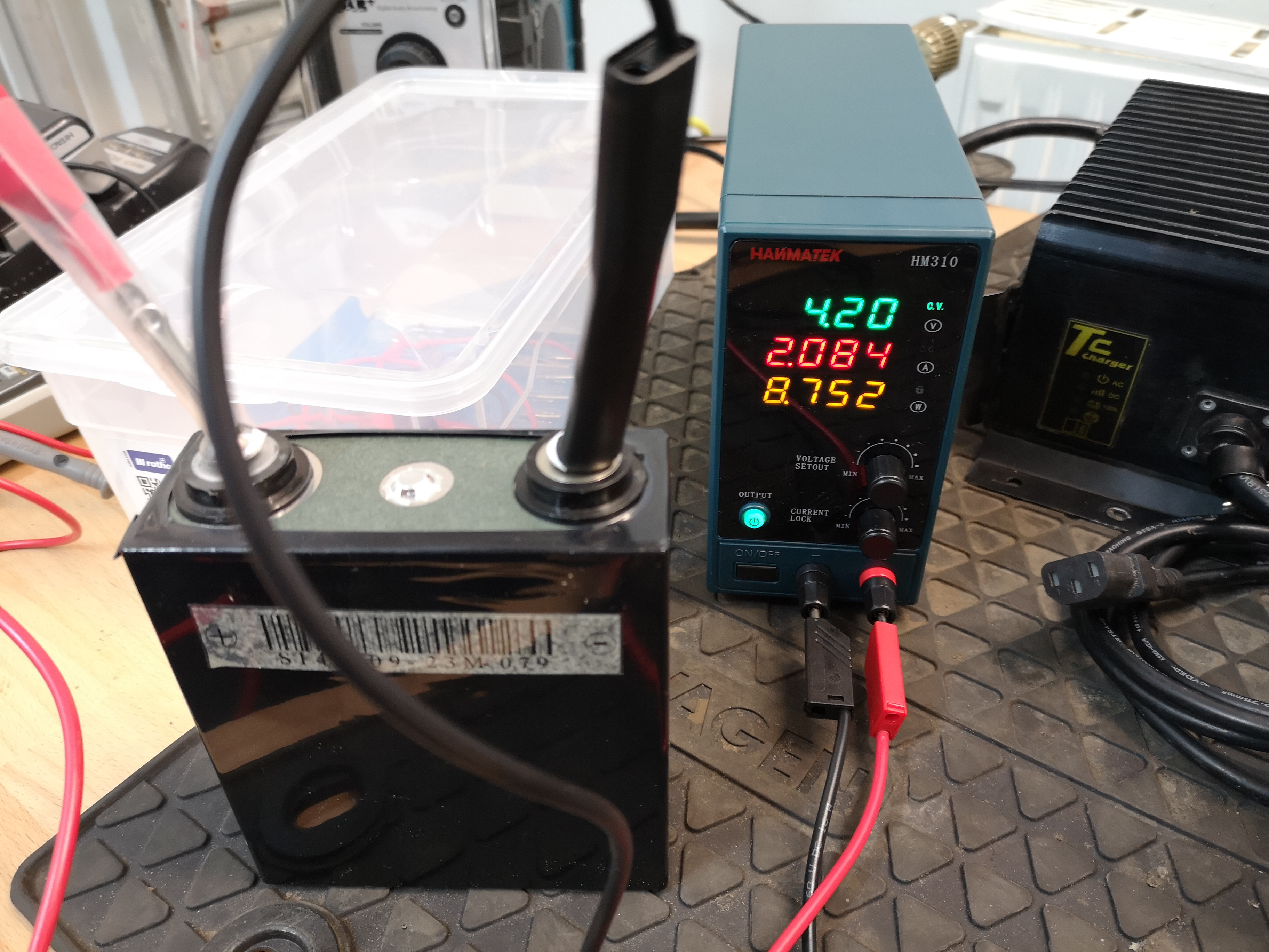 Die Zellen sind leicht bauchig und weisen Spannungen um 3,9 Volt auf. Eine Zelle habe ich mit Labornetzteil (4,2 Volt und 5 Ampere) nachgeladen. Es quält sich hoch, erreicht aber kaum 4 Volt. Also die Zellen sind deutlich gealtert, was nach 8 Jahren ja auch nicht verwunderlich ist. Die 20 Zellen sind genau ins Gehäuse einpasst. Größe der Blockzelle LxBxH 12x4,7x14 (mit Schraube) cm. Leider finde ich keine passenden Zellen, die sind alle länger.