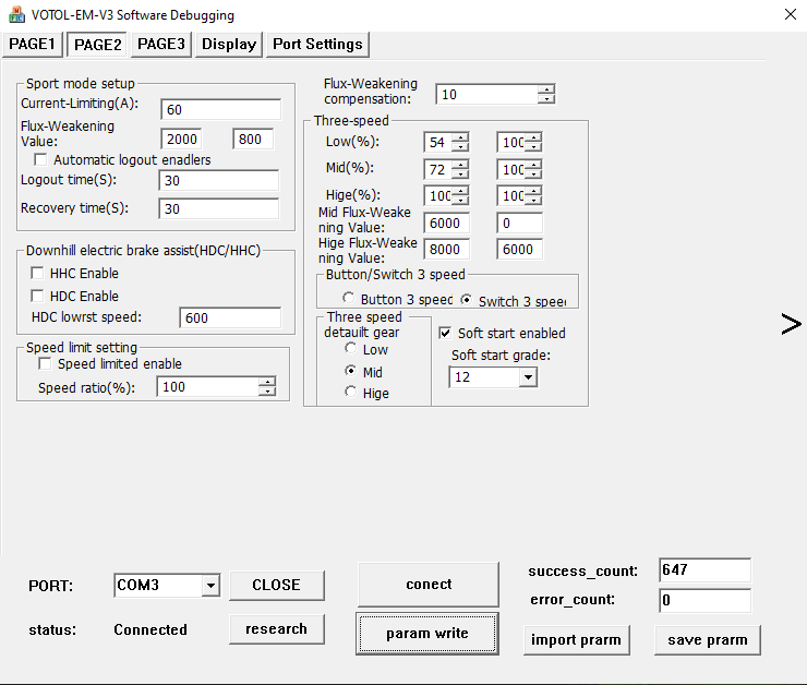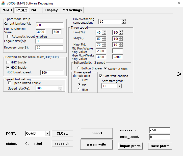 Ich hatte da auch immer mal Probleme, dass ich keinen neuen Programmier-Werte Abspeichern konnte, weil das Gerät ab und zu noch dachte es dreht, obwohl das Rad schon gestoppt hatte. Im Low-Speed-Gear ohne flux weakening sollten unterschiedliche Auswirkungen wegen Feldschwächung erkennbar sein.