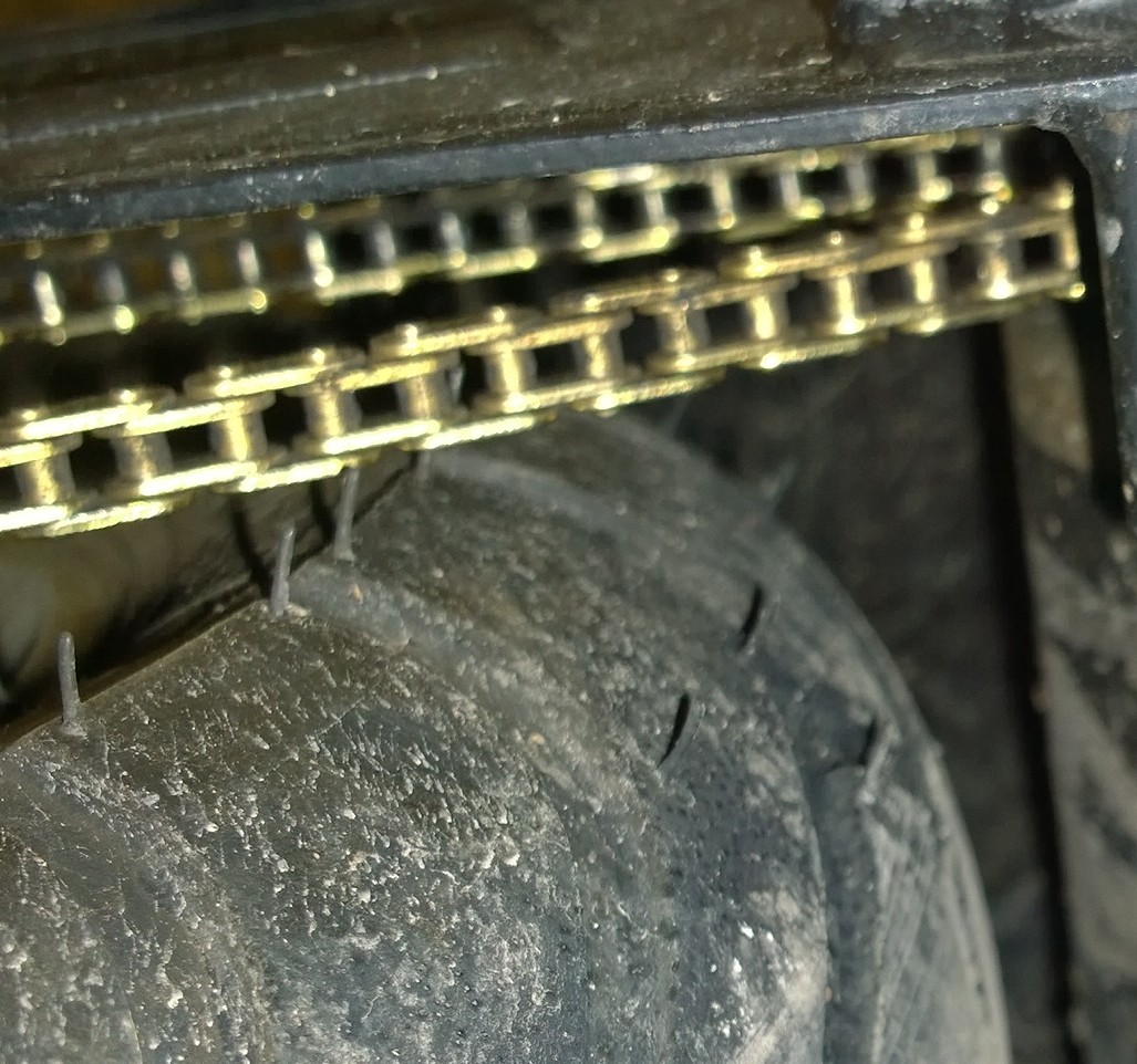 Habe die Kette etwas angezogen, jedoch hilft das nicht, da die Kette viel zu nah am Rad allgemein ist. Zu fest soll man die Kette ja auch nicht spannen. Die Kette ist so nah, dass es die abstehenden Noppen berührt.