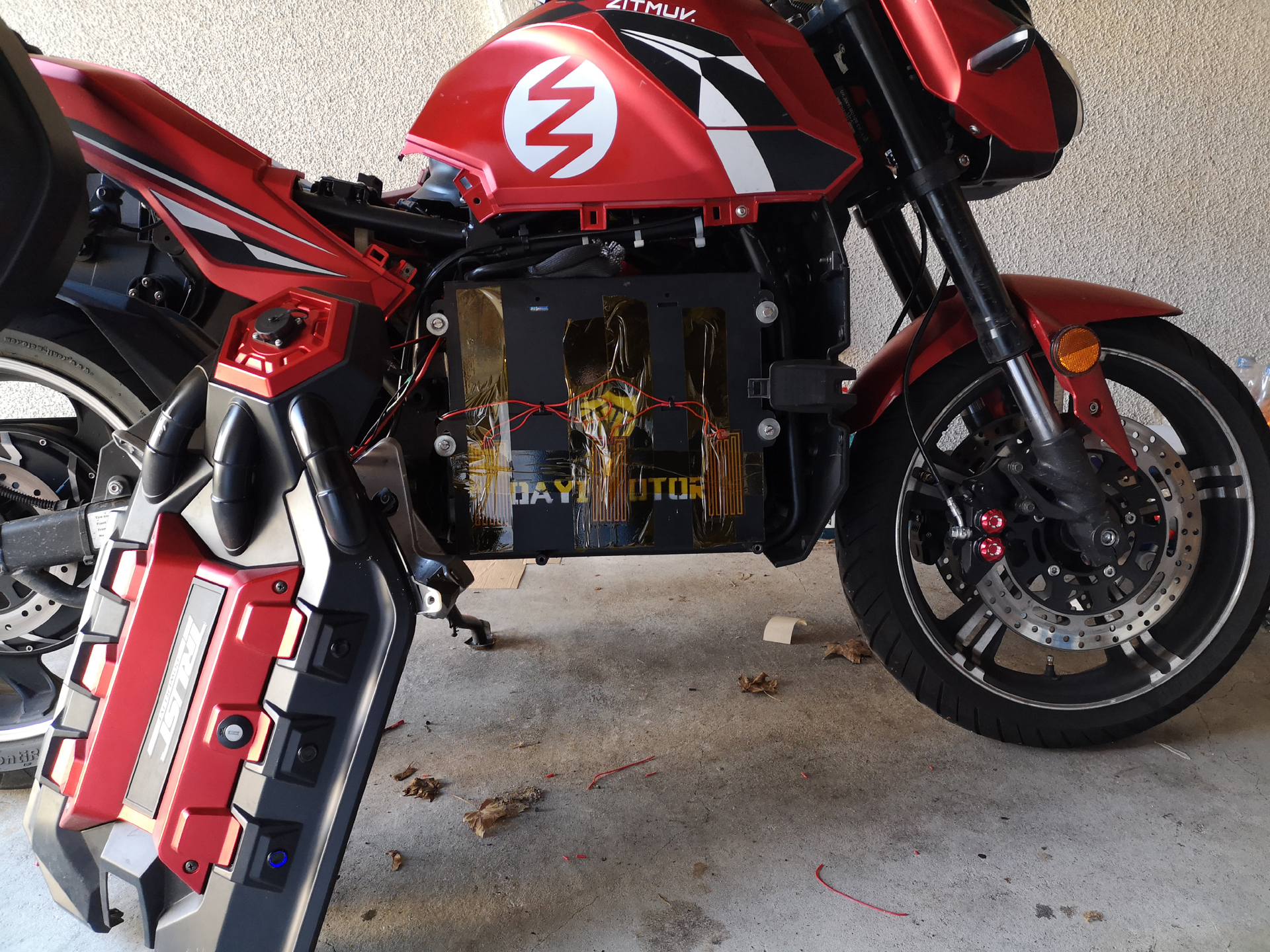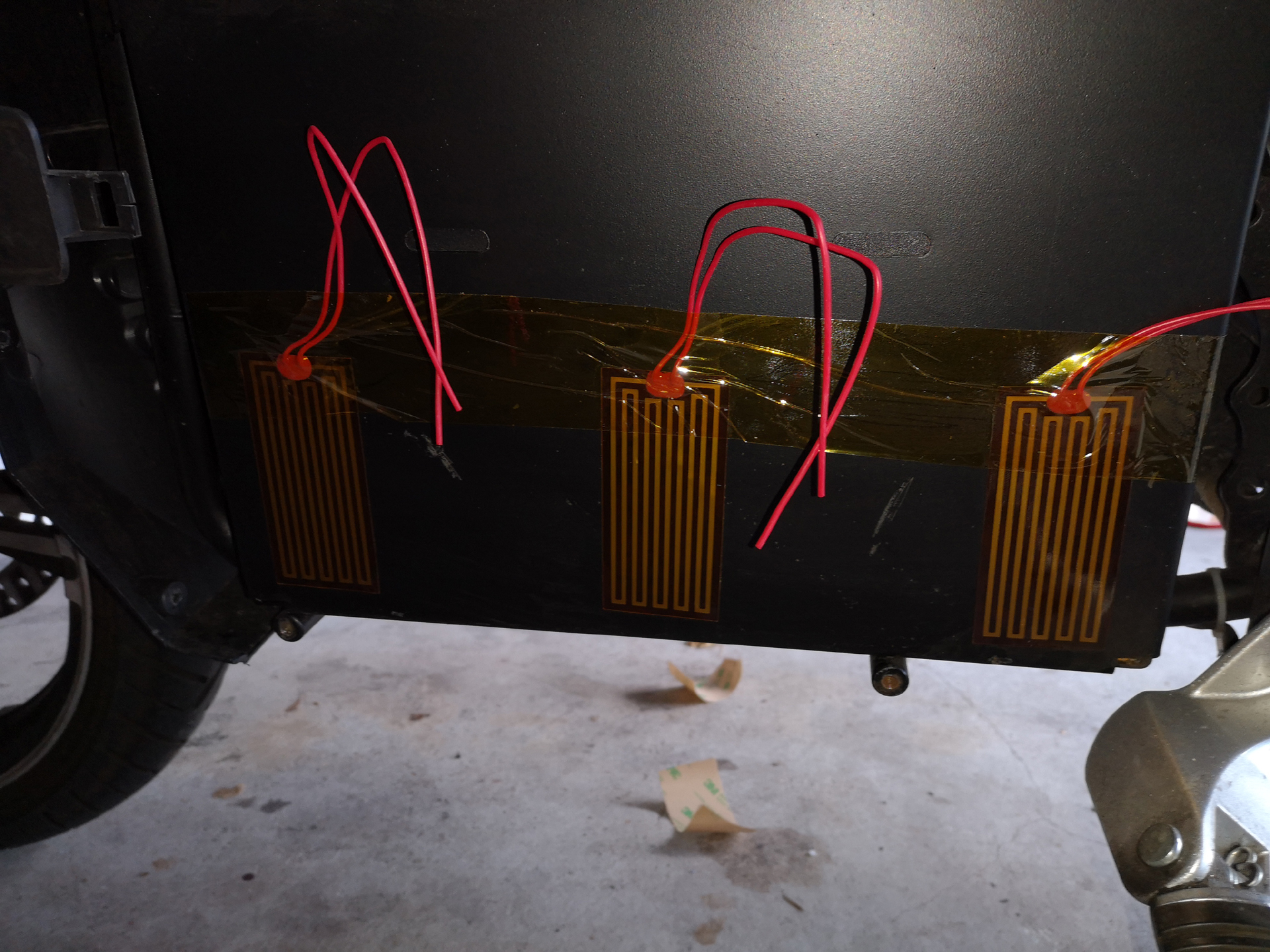 :arrow: Zum Einsatz kommen 6 selbstklebende 24V / 30W Polyimid Heizfolien. Jeweils 3 in Serie geschaltet und links und rechts auf dem Akku-Kasten aufgeklebt.