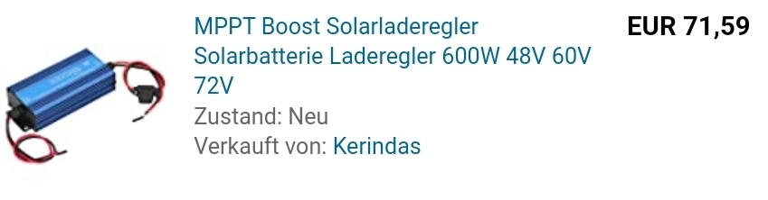 Ich kann dann mittels XT90 Stecker auf einen Step Up MPPT Solarregler umbauen. Erste Versuche mit dem 7210A waren mehr als ernüchternd. Habe jetzt einen 600W Regler bestellt. Ich werde den Aufbau dann im "Solartankstellen" Bereich vorstellen.