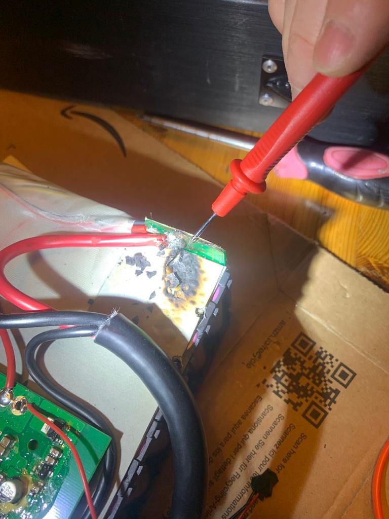 Die verbrannte Stelle kommt wahrscheinlich vom Löten des Pluspols.