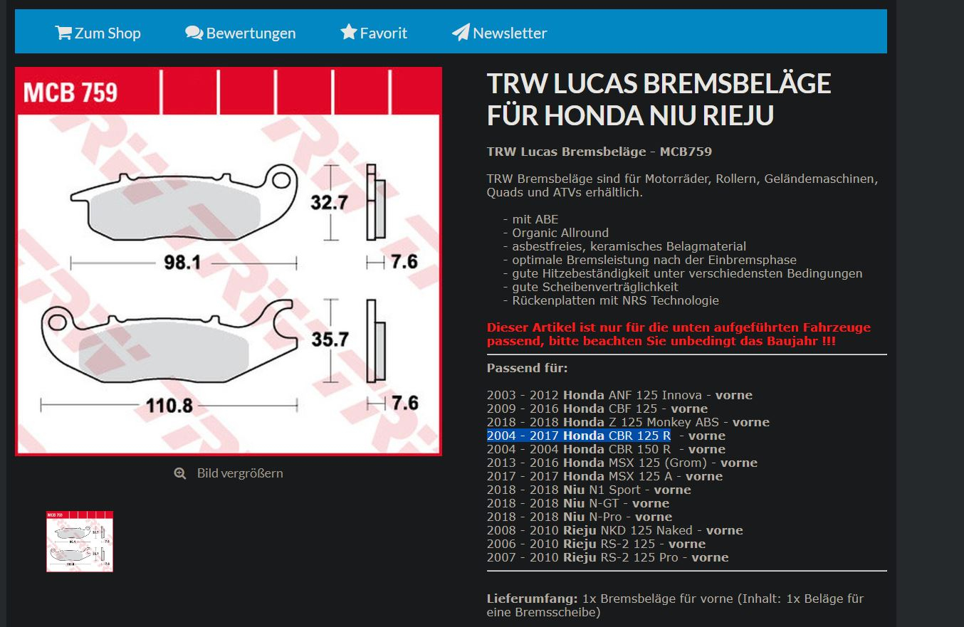 Bsp. schreibt einer der Ebay-Verkäufer das die Beläge für die Modelle passen