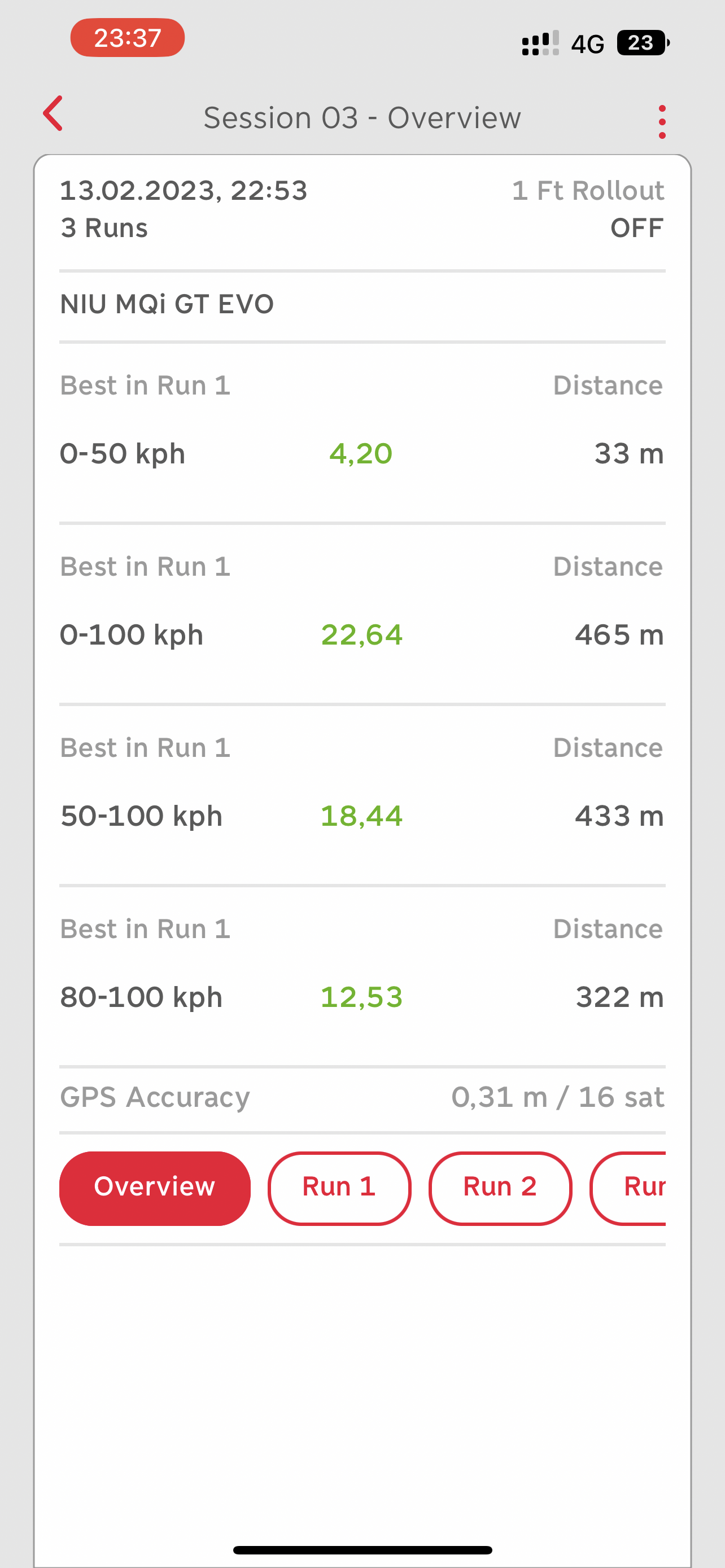 Hallo, danke für eure Meinungen. Im Anhang einige Versuche eines 0 bis 50 kmh Beschleunigung mit race timer. Ein paar Versuche haben sicher nicht ganz richtig funktioniert. Die Höchstgeschwindigkeit muss ich erst testen.
