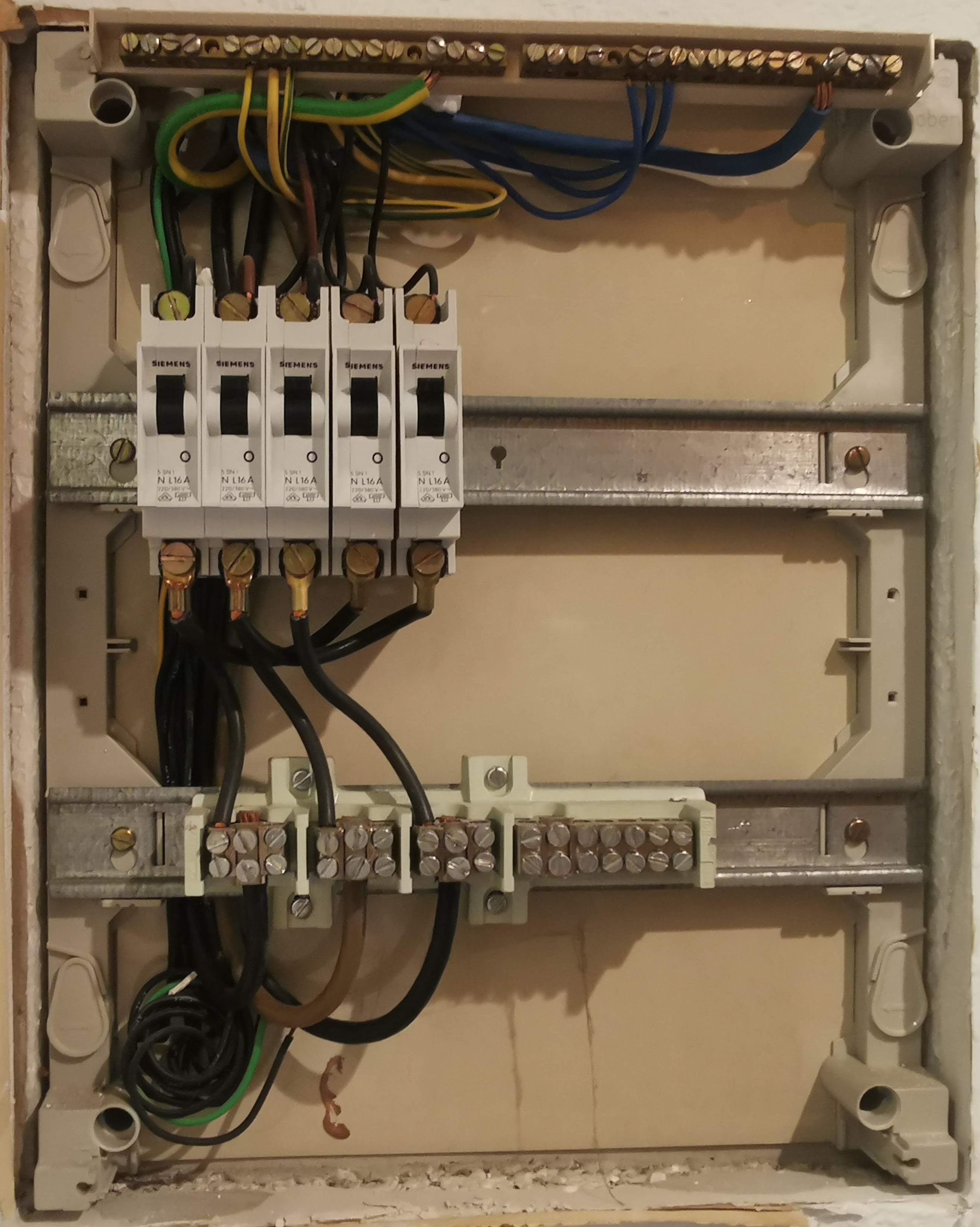 Also clipse ich ein weitere 16A Leitungssicherung auf die Schiene, führe von unten eine der Phasen durch selbige, schließe oben Neutral und Erde an und das war's dann. Oder?! :?