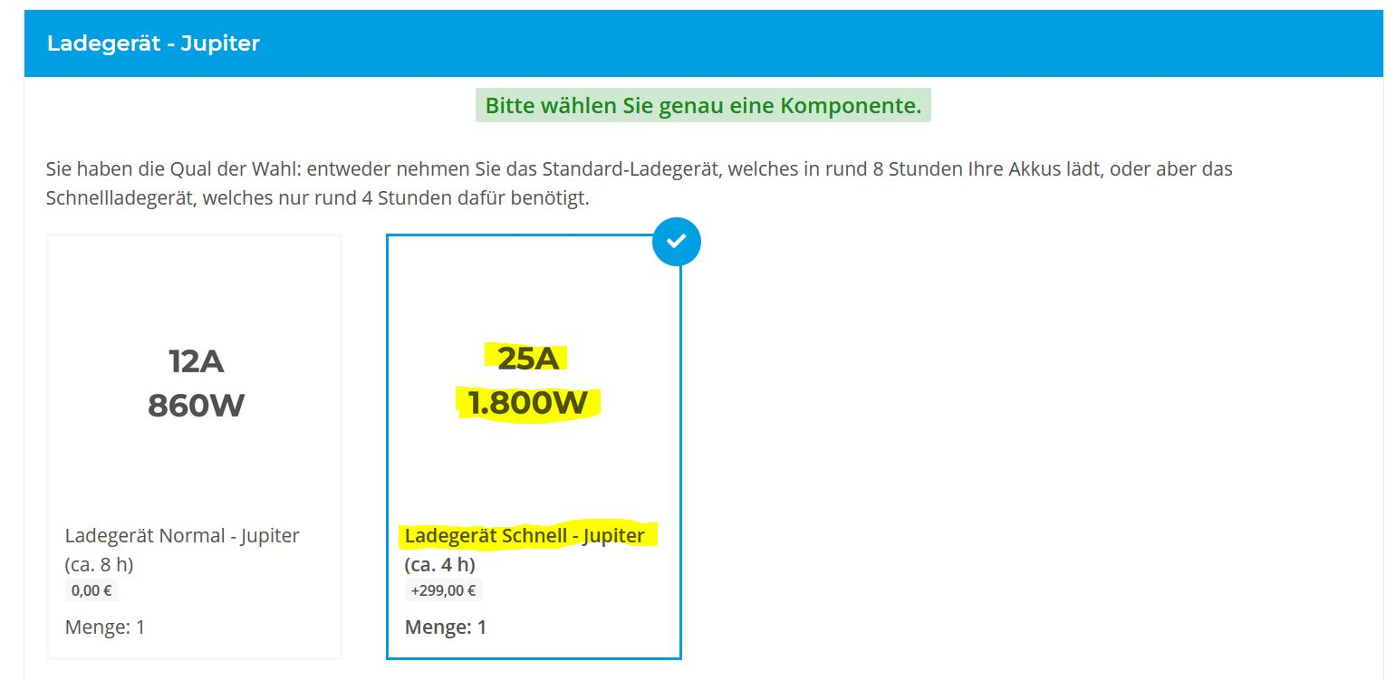 Der eingebaute Schnelllader bei meinem zukünftigen Jupiter läd mit 25A / 1800 W bei 72V.