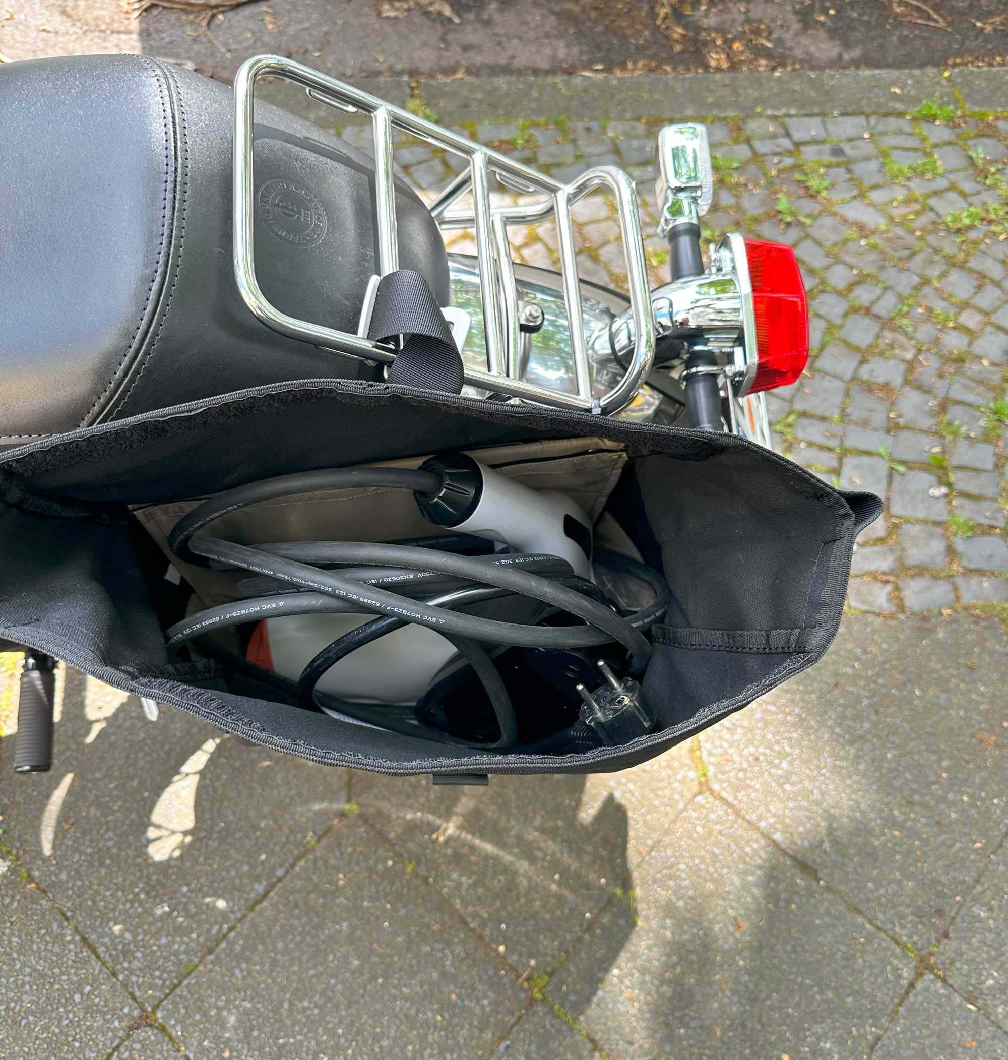 Ausprobiert habe ich sowas auch schon, das kommt mir nur alles zu dicht an die Maschine heran und es hat nur oben Befestigungsmöglichkeiten. Meine Sorge ist, dass das dann auch noch den Chrom an Federbein und Blinker abschrubbt, und kleinere Taschen mal bis ans Rad gelangen. Und der Traum geht in Richtung Ledertasche. Und dann wären Abstandshalter nach unten hin schon toll, um ein "Schlabbern" der Tasche zu verhindern.