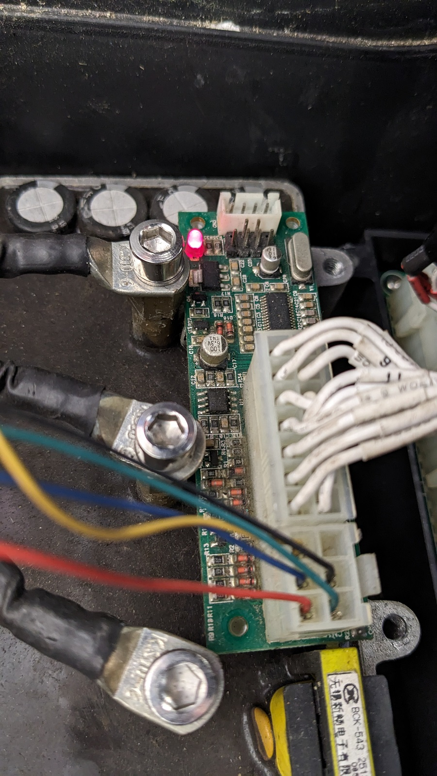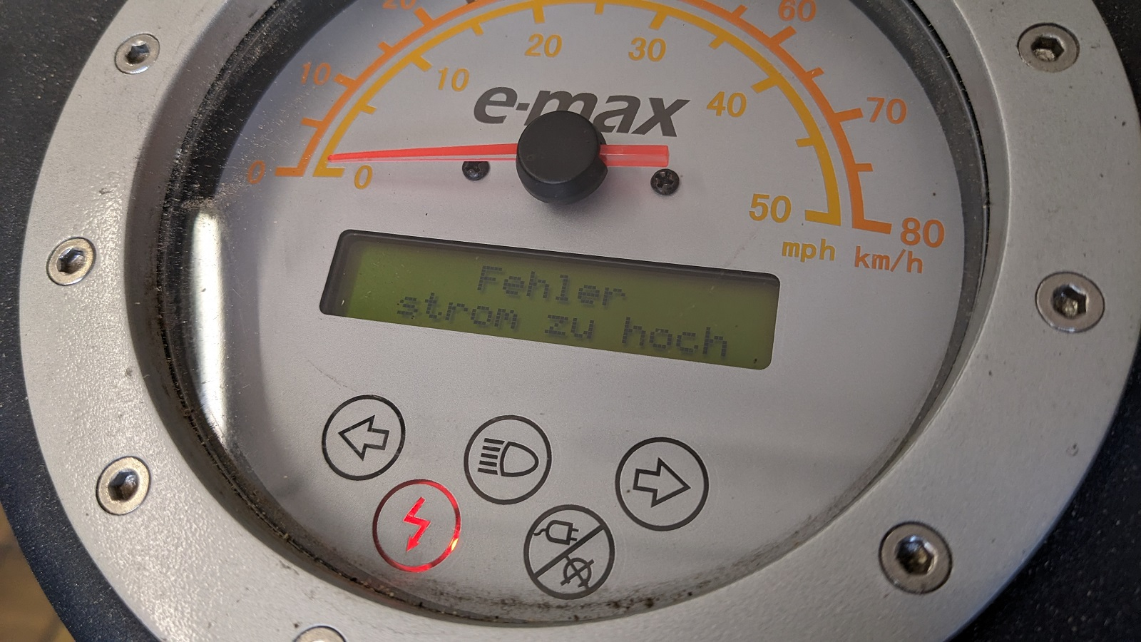 Festgestellt, daß die eine Umwandlerelektronik (das 12V Netz) sich nicht mit dem Leistungsteil des Motors verträgt, dann spielten Hupe, Licht und Blinker verrückt. Dann festgestellt daß das Leistungssteuergerät des "neuen" Roller defekt zu sein scheint. Auch ohne Motor blinkt es viermal "Over Current".