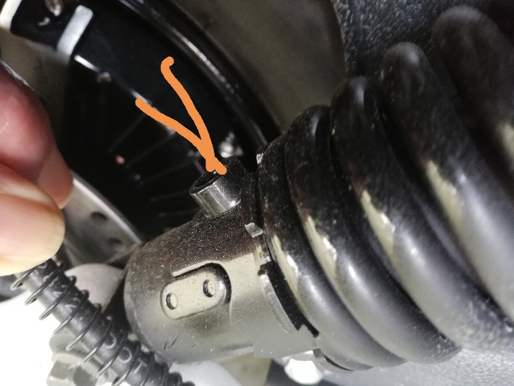 Genau in dieses Loch ein gut passendes Werkzeug stecken und beide Seiten in die gleiche Kerbe stellen, vorher am besten die Dämpfer sauber machen, dann dreht es sich leichter und leider, ich nehme meist ein 6er Inbusschlüssel.