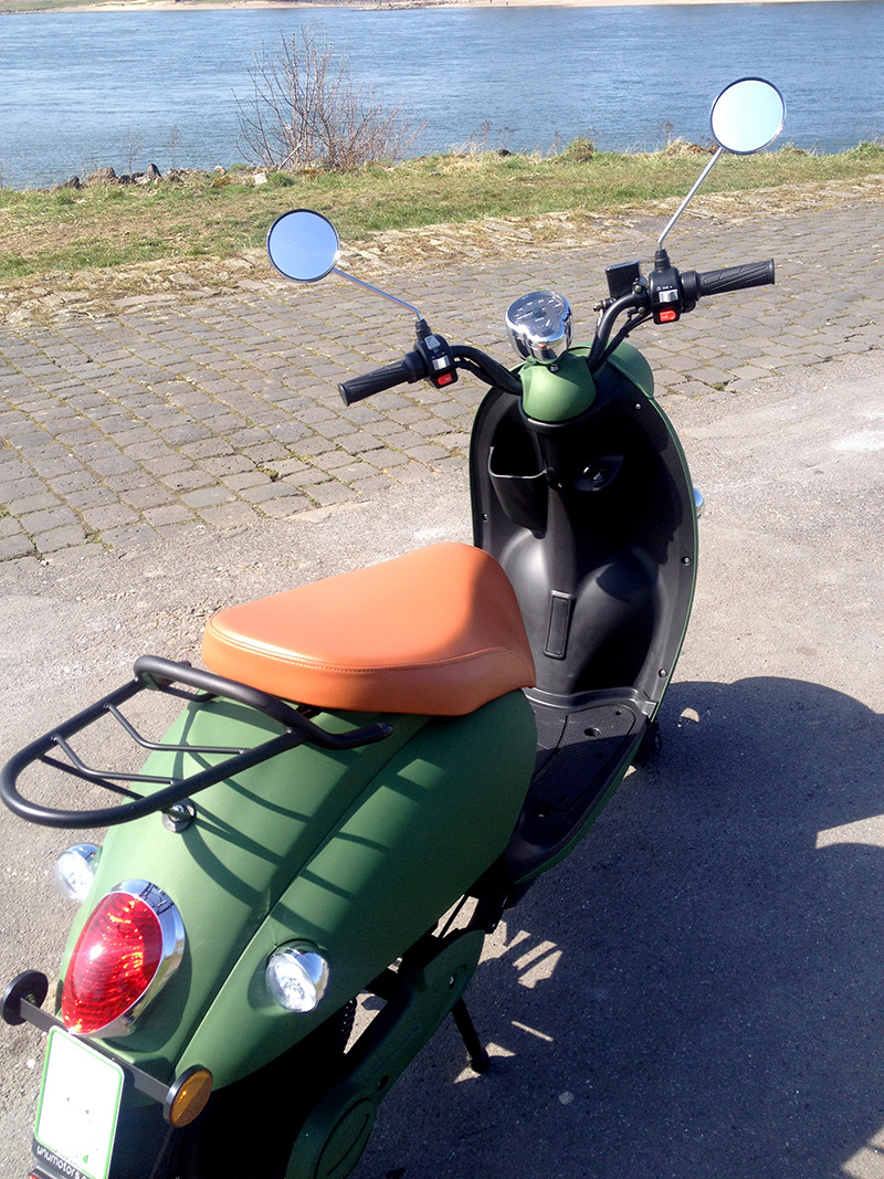4. Reichweite: Ich habe den Akku bisher nicht ausgefahren; bei hügeligem Gelände, allen Lampen an und "sportlicher" Fahrweise (so sportlich wie ein 45er Roller halt sein kann) sind 50km in jedem Fall drin.