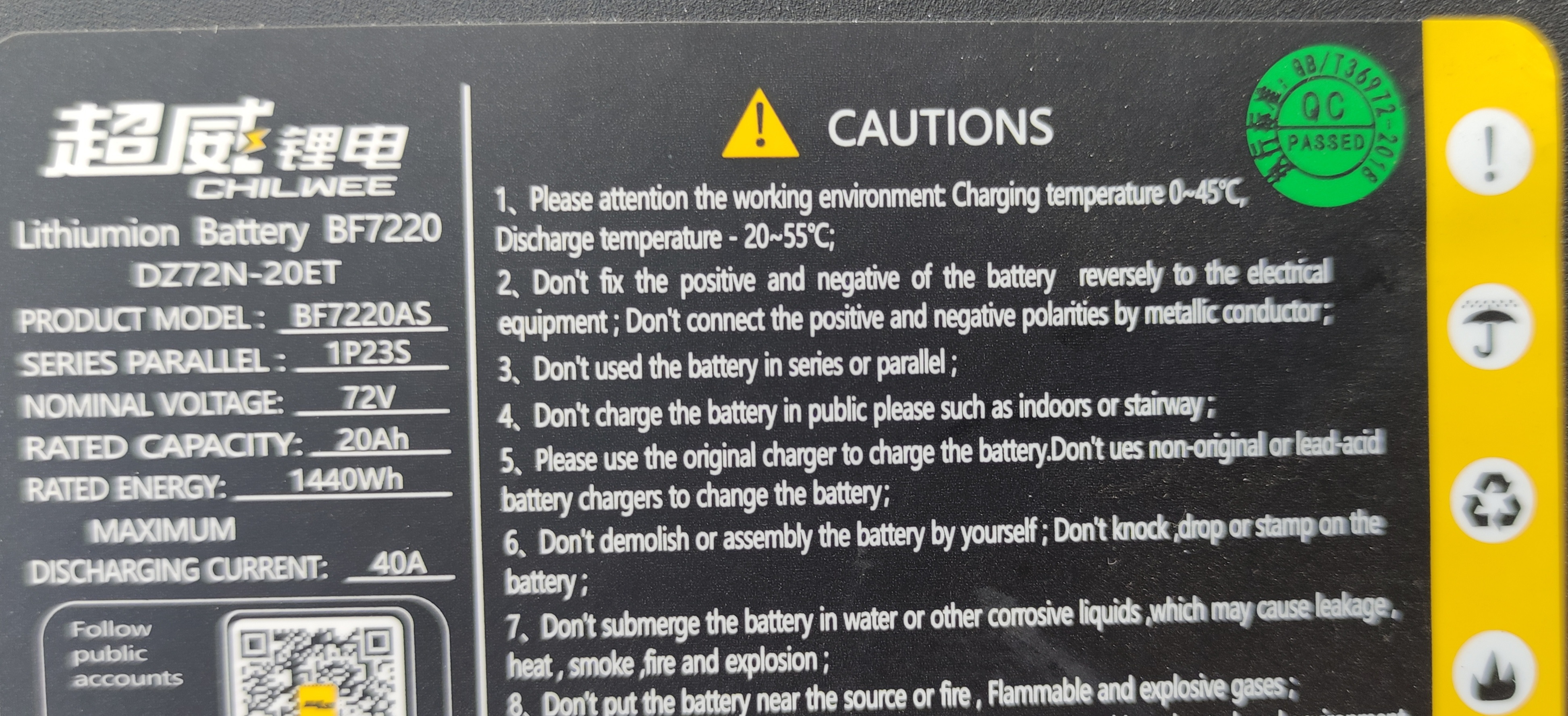 Der Akku auf dem Foto ist ein 72Volt mit 23s LFP - also Eisenphosphat. Nennspannung der Zellen (bei kleinem Strom) 3,2 Volt x 23 = 73,6 Volt, der entsprechend unter Laststrom einer Mittleren Spannung von 72 Volt nahe kommt, auf die der Motor ausgelegt ist. Das Ladegerät dafür müsste (bei Nennspannung 72 Volt) eine Ladeabschaltspannung zwischen 83 und 84 Volt haben.