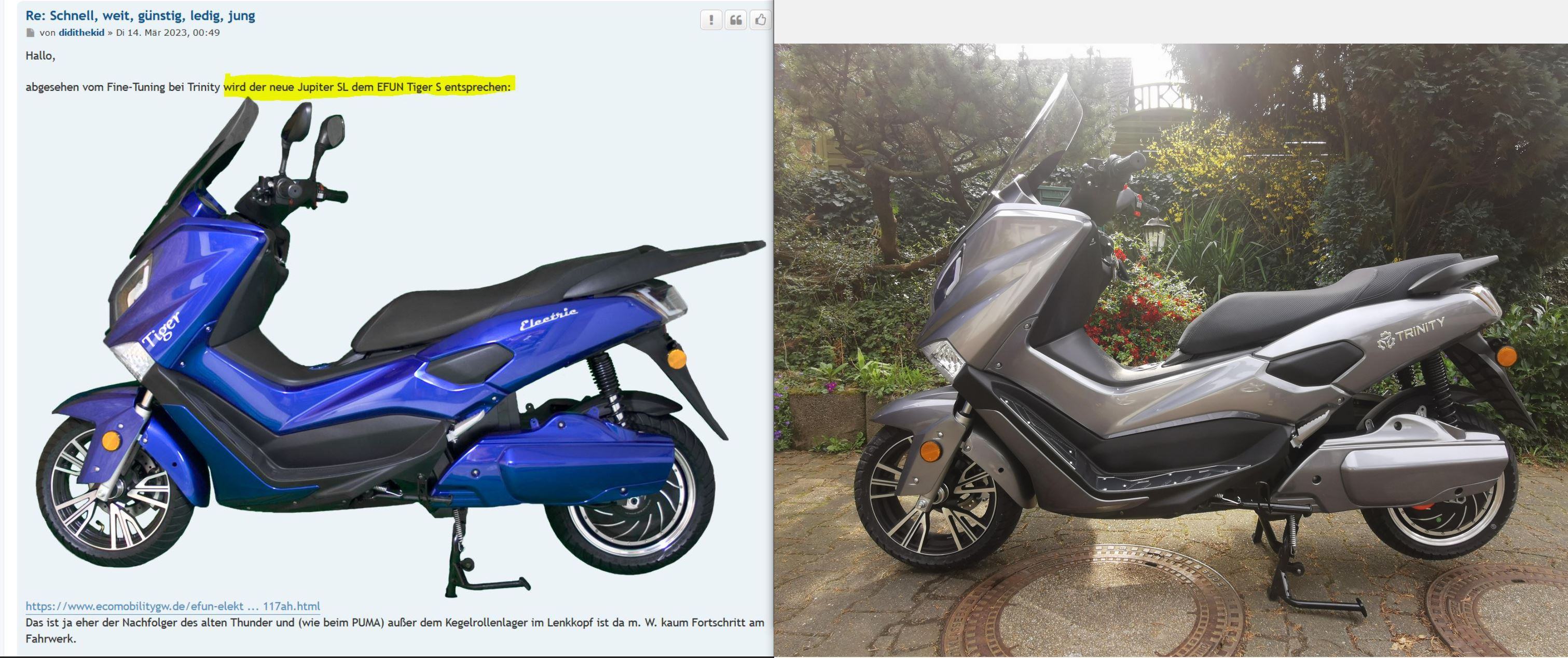 Gerne. Der EFun Puma war (bis 2022?) der Vorgänger des aktuellen EFun Tiger, vom jeweiligen Importeur unter eigenem Namen (z.B. Trinity Jupiter) verkauft. D.h den Puma (alter Jupiter) wird es vermutlich neu - außer seltener Restbestände - nicht mehr geben. Aber durch genau diesen bin ich letztes Jahr auf den Jupiter aufmerksam geworden. Erscheint auch mir deutlich größer dimensioniert. Guckst Du: