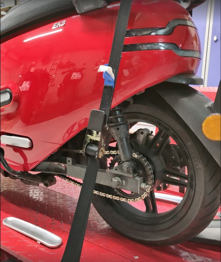 Dann habe ich den Roller auf der Bühne "niedergezurrt" und erneut gemessen: Durchhang diesmal: 4,5cm.