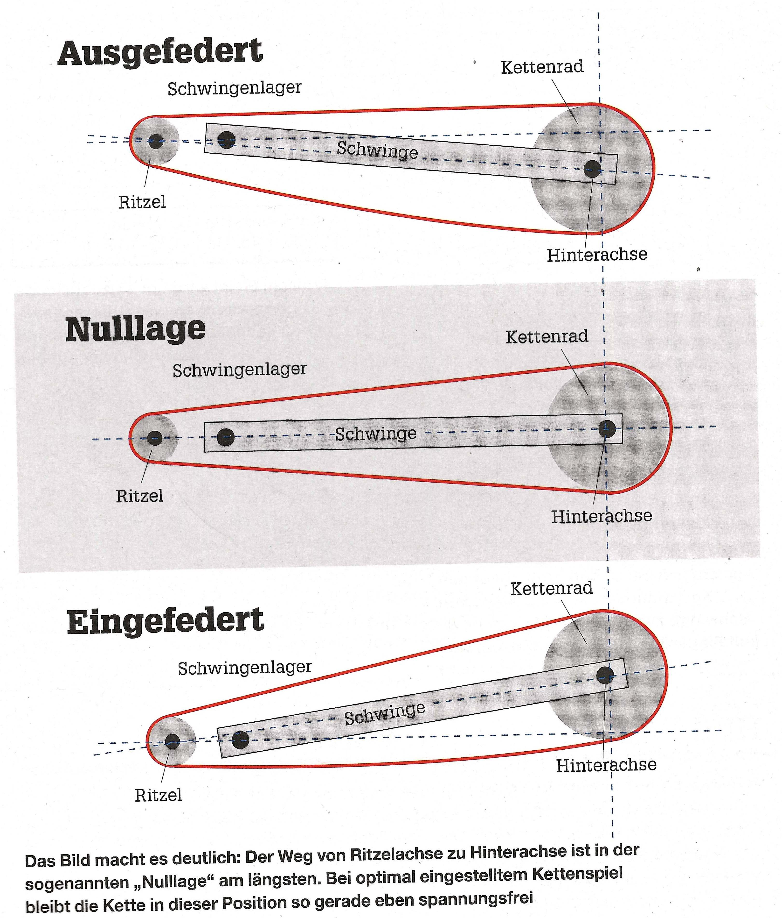 Was heißt das im Speziellen? Die Schwingen-Geometrie bei eigentlich allen Motorrädern ist derartig konzipiert, dass wenn die Schwinge einfedert, sich die Kettenspannung erhöht. Das heisst für die Praxis, dass die Kette im ausgefederten Zustand der Schwinge ein gewisses Spiel haben muss, damit sie beim Einfedern nicht zu sehr gespannt wird und dadurch der Verschleiß und die eben beschriebene Beschädigung des Getriebelagers vermieden werden.