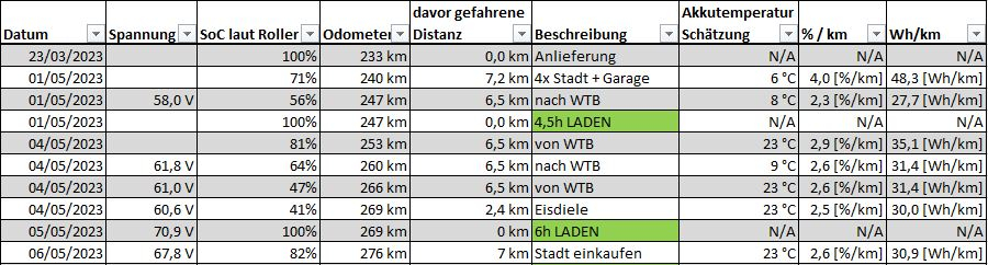 Ich habe den Roller vor ca. 6 Wochen gebraucht gekauft (2 Jahre alt), SoC war da 100%. Seiter nie aufgeladen und bei ein paar Stadtfahrten laut Anzeige 37% Akku verbraucht. Der Akku war immer im Roller eingesteckt und die Sicherheitsschalter eingeschaltet. Laut Bedienungsanleitung soll man aber alle 4-6 Wochen den Akku laden, um ihn vor Schaden zu bewahren und bei längerer Nutzung den Sicherheitsschalter ausschalten. Könnte es sein, dass der Akku sich so stark selbst entladen hat? Warum das BMS dann so weit daneben liegt, ist mir schleierhaft.
