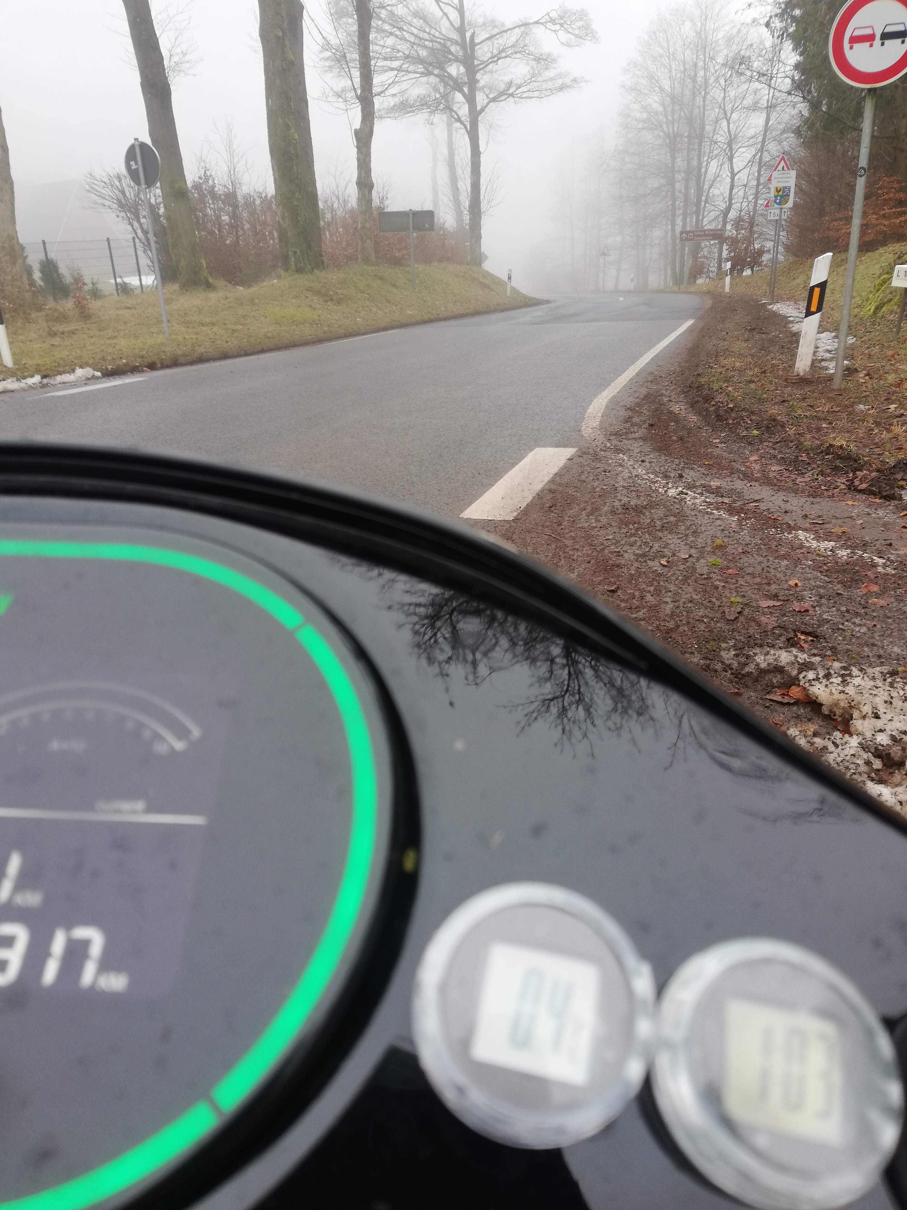 Heute morgen am Heuberg im Thüringer Wald. Es war leichter Nieselregen. Im Tal waren 2,6 und auf dem Berg 0,4 Grad und ich fragte mich ob es glatt werden könnte. Die kalte Luft hat etwas erfrischendes und tut irgendwie gut. Die Hände kühlten mit heizbaren Handschuhen nicht aus.
