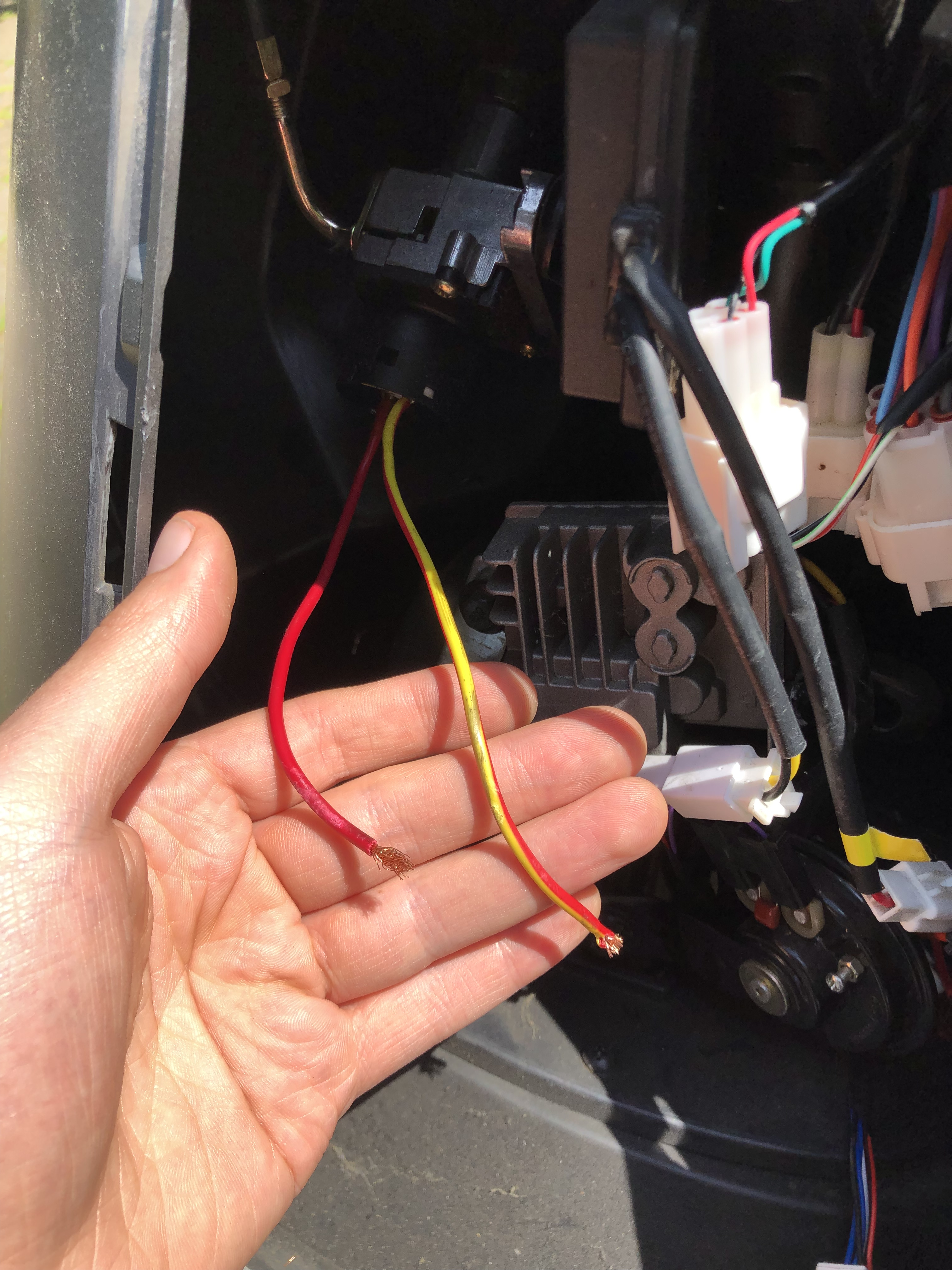 Nur kriege ich den Roller nicht mehr zum laufen. Weiß jemand wie es verkabelt sein muss? Ich sehe noch an der rechten Seite ein drittes loses kabel das zerschnitten wurde. Vielleicht waren die drei über einen Stecker verbunden.