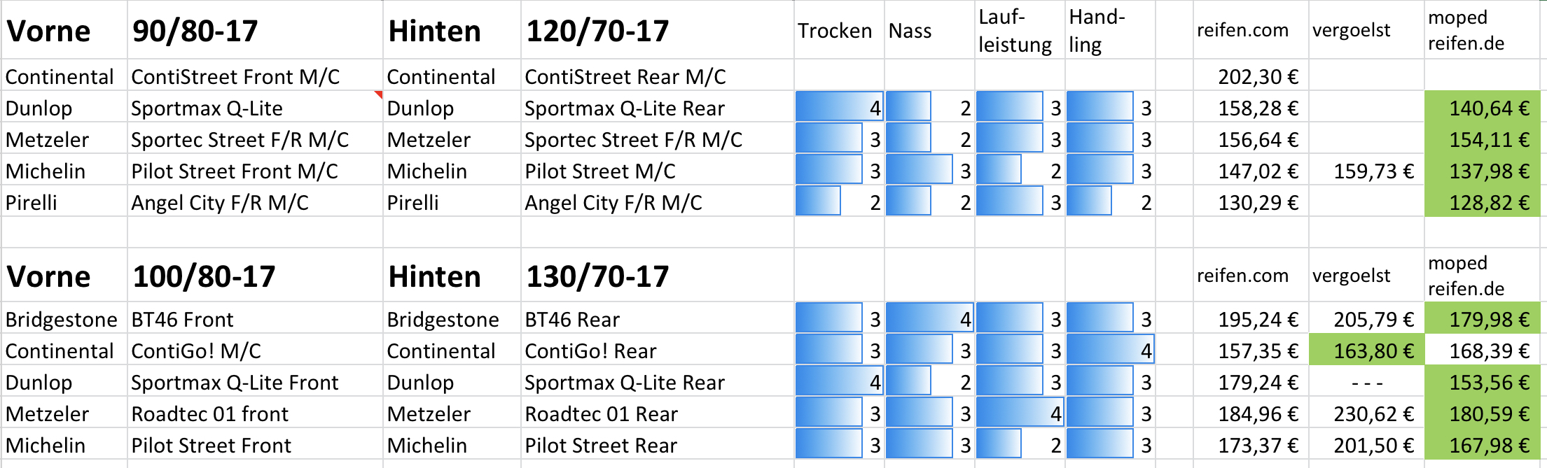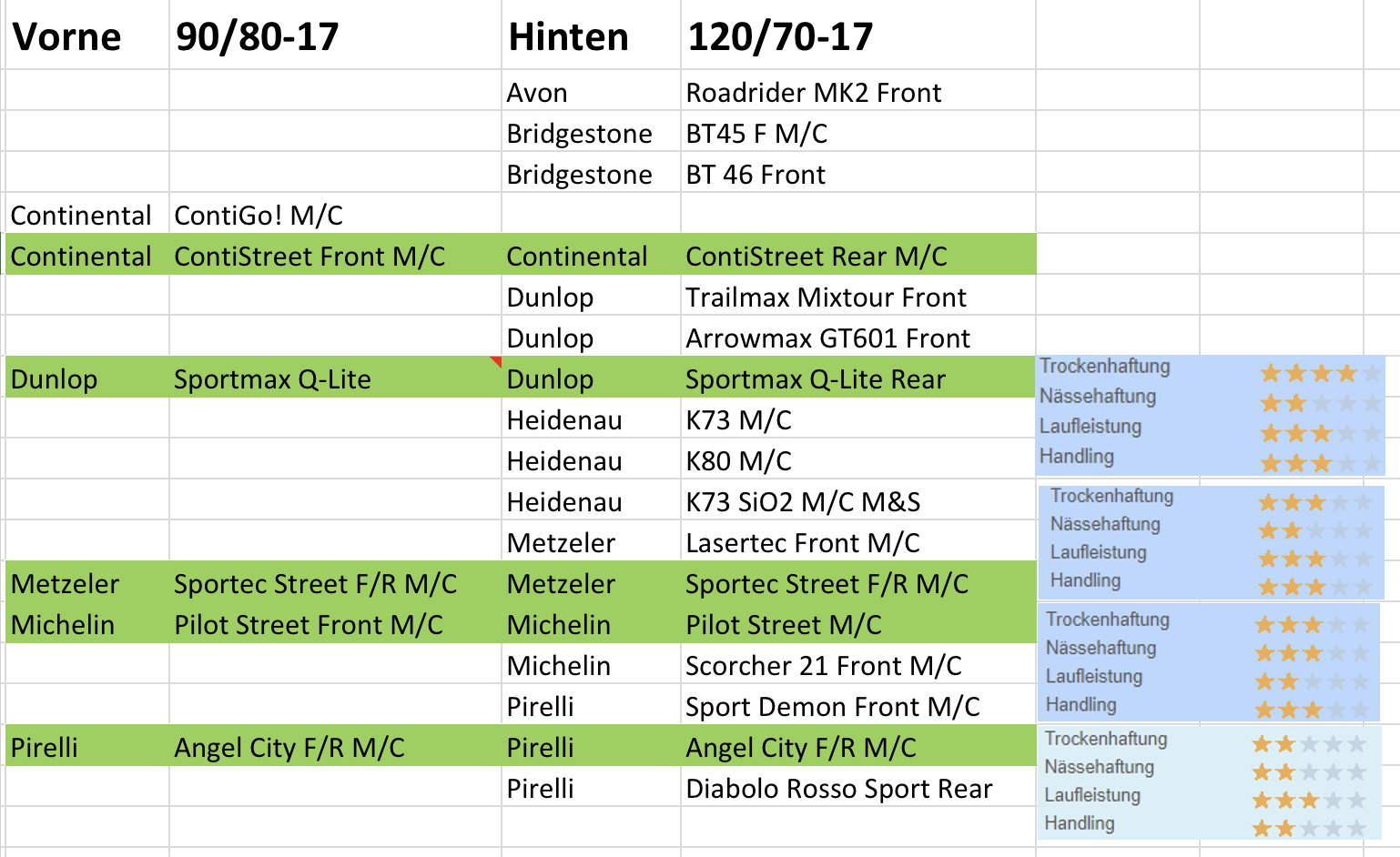 Die Bewertung stammt vom Shop Mopedreifen - ist mir klar, dass diese (a) sich auf sicherlich ganz andere Größen und andere Motorräder beziehen und (b) daher nur äußerst eingeschränkt auf die Max übertragbar sind. Aber ich denke dennoch, dass diese als grobe Orientierung herhalten kann.