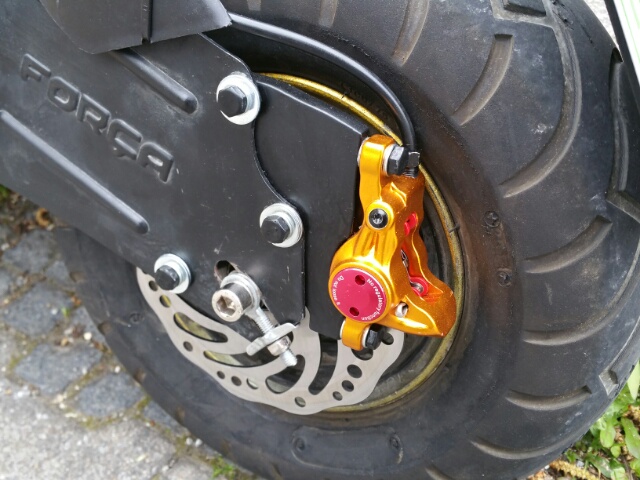 Meine Idee war auch bedingt durch den Frust mit der bescheidenen Bremsanlage im Vorfeld....kaufen-ranschrauben-bremsen-geil.....Kannst vergessen zumindest mit dem Forsa Modell und den Reifen (13x5-6)