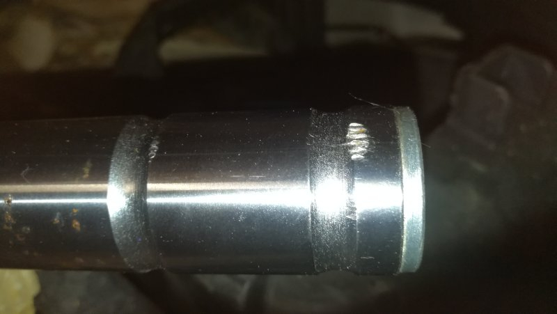 Als ich vorne einigermassen freigelegt hatte, viel mir dann erst auf, dass die 4 Schrauben der Gabelklemmung nicht gleich waren, und dann, dass eine etwa einen Millimeter raus stand. Ich hab kurz probiert, sie anzusiehen, das aber sofort drangegeben, weil es sich komisch anfühlte. Also alle 4 Schrauben erstmal raus...