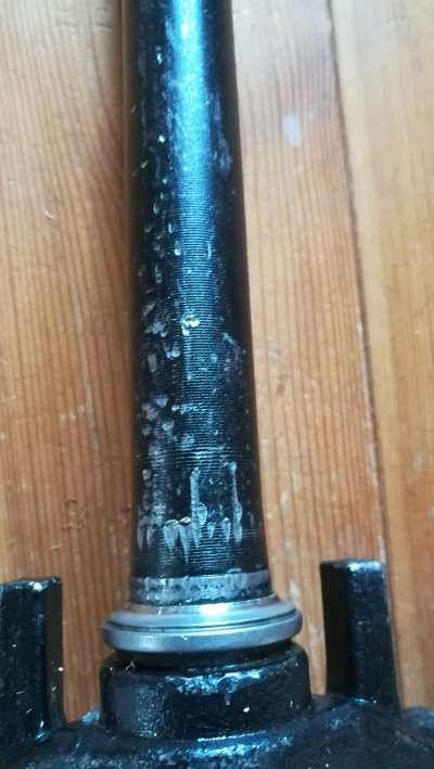 Unten 30 innen passt. Das untere Lager sieht erheblich besser aus. Es sieht mir auch so aus, als hätte das jemand neu gemacht - diese Spuren auf der Achse zeugen ja wahrscheinlich von dem mühseligen Runtertreiben der Lagerschale?