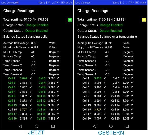 Das BMS hat jetzt 14 Stunden balanciert, pendelt dabei immer zwischen Balancing und Over Temperature, aber besser geworden ist nix. Ist das normal? Und knapp 0,2 Volt Differenz ist doch auch nicht zu vernachlässigen, oder?