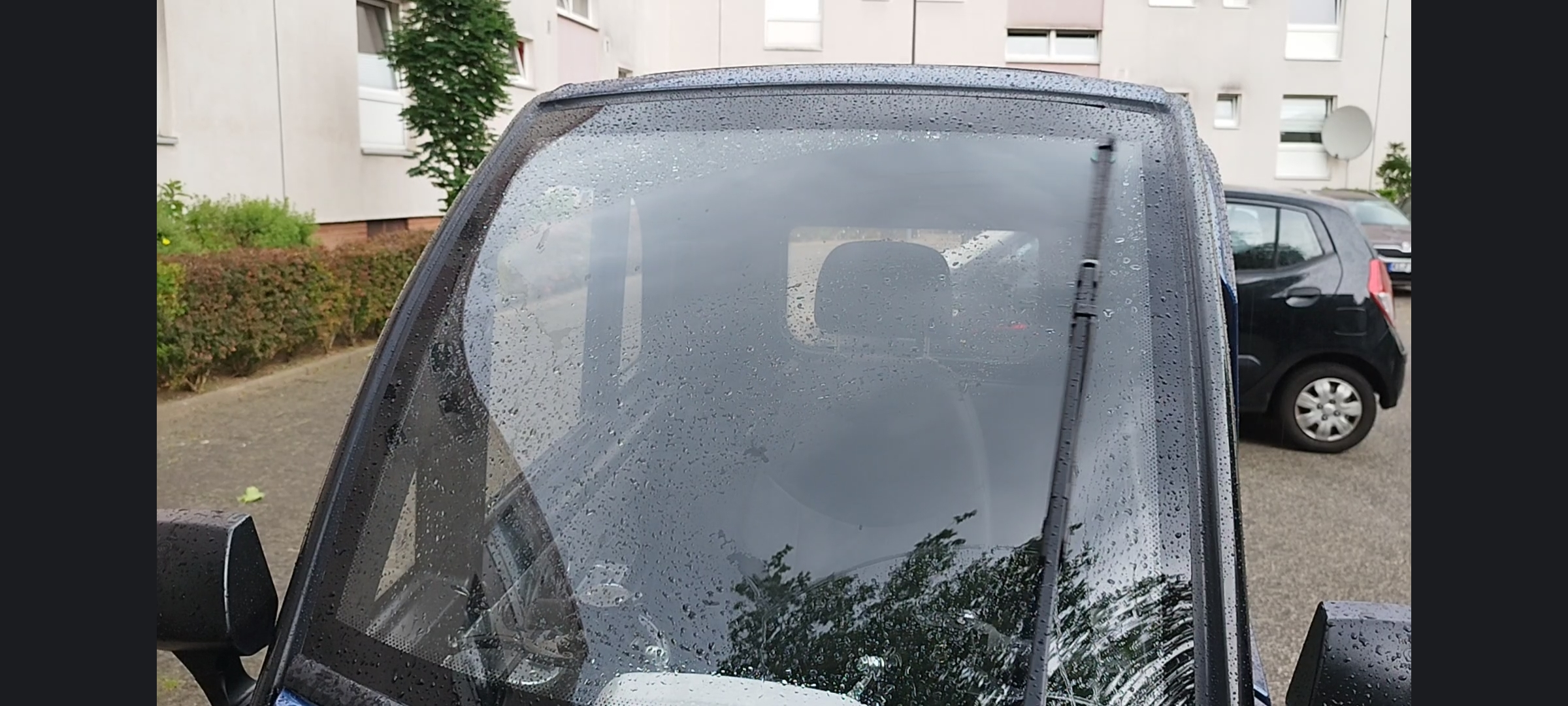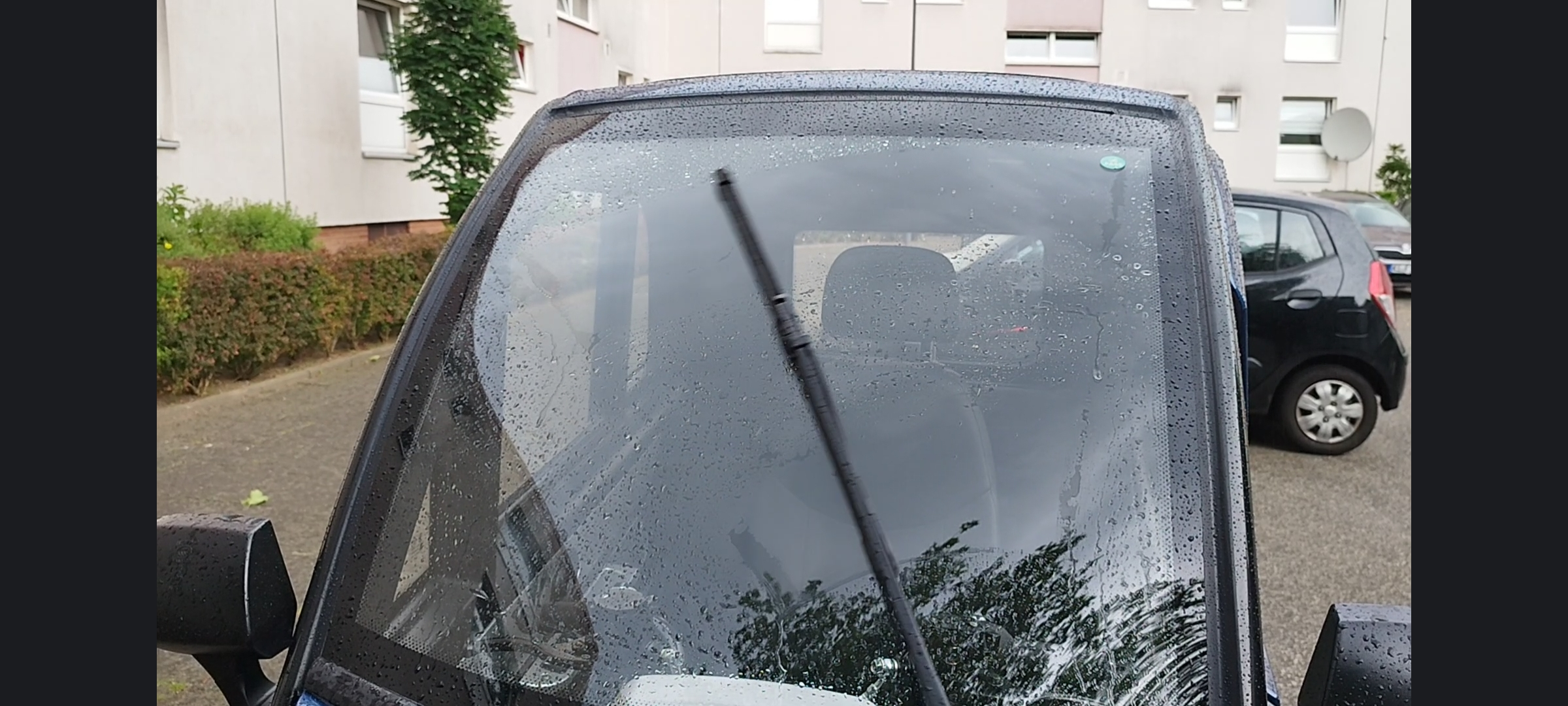 Leider regnet es nun und uns ist aufgefallen dass der Scheibenwischer aufgrund der Biegung nicht in der Mitte wischt, also genau den Sichtbereich ausspart. ;-) Siehe Bildanhang!