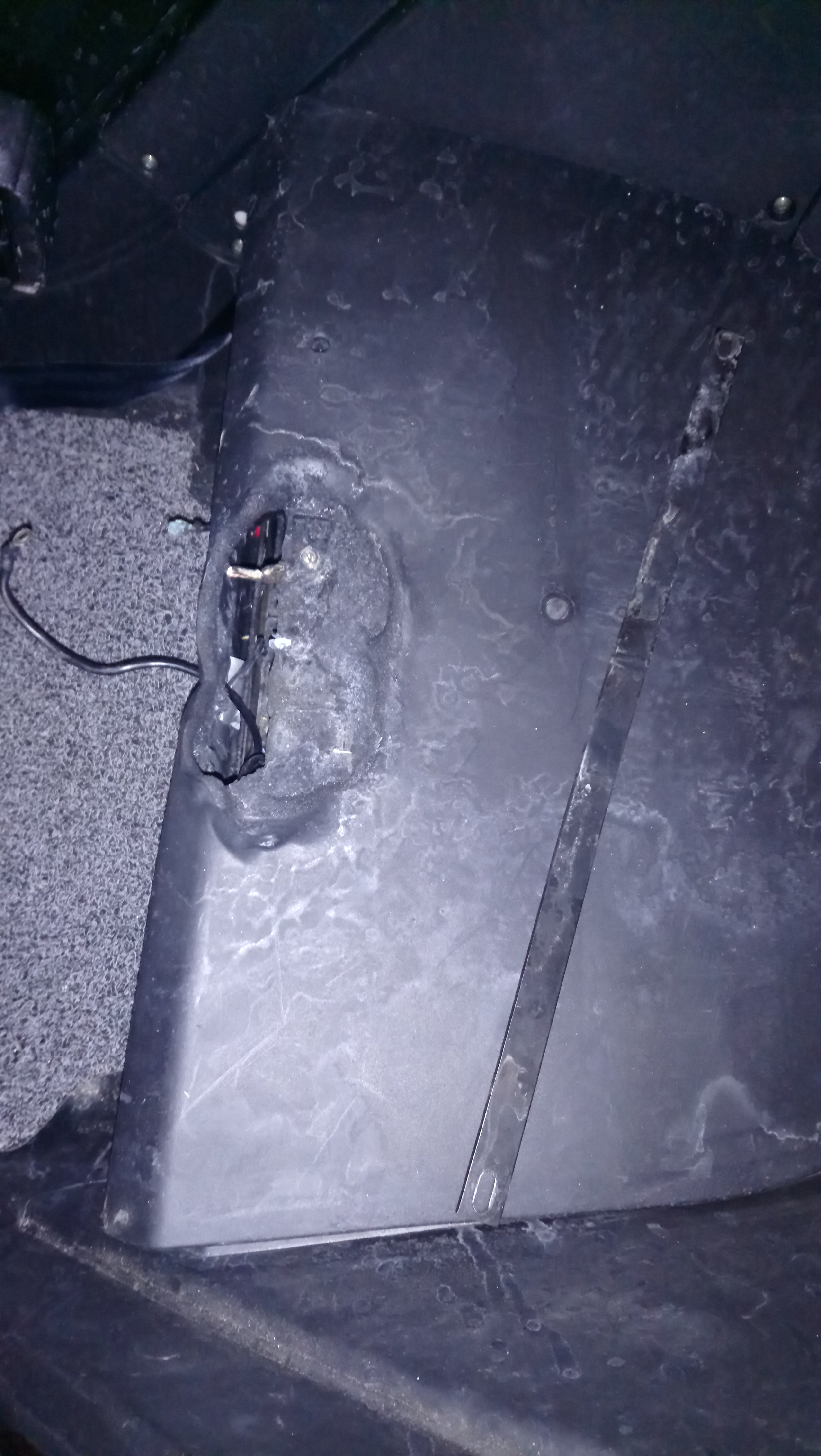 Nachdem der Qualm nachließ, habe ich den 2. Sitz abgenommen und eine fast schon weggeschmolzenen Batterieabdeckung vorgefunden, unter der es immer noch qualmte.
