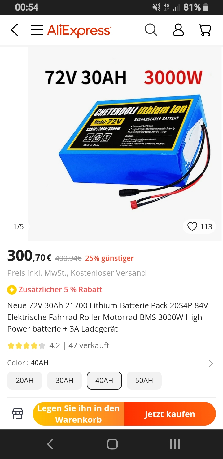 ich kann aus eigener Erfahrung auch nur abraten von den Billigangeboten. Wie der TE in meinem Threat darüber lesen kann, ist das rausgeschmissenes Geld. 72V 40AH bedeutet bei mittelmäßig guten und geeigneten Zellen 20S 10P. Also gut 200 Zellen. Wenn eine Billigzelle dem Hersteller auch nur 1,50€ kostet und er das BMS, Leitungen, Stecker, Zellenhalter, Schrupffolie usw. dazu rechnet kann er den Akku schon verschenken.