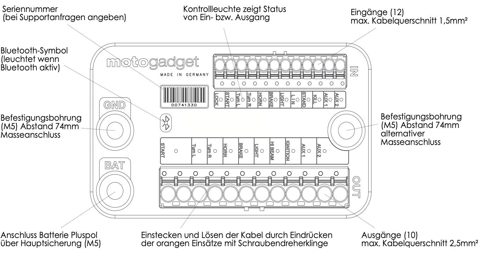 Der Gedanke ist folgender, die mo.unit ist aus, der Start Taster (E-Lock) hat keine Spannung, also passiert beim Starten nichts.