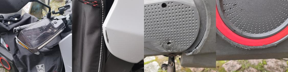 Am Roller gibt es ein paar Kratzspuren an der Frontverkleidung, der Akkuabdeckung und der Schwinge (und kaum wahrnehmbar am Topcase). An der Hose ist nüscht, die Jacke am Protektor etwas abgenutzter (nichts kaputt), nur der Handprotektor ist wirklich hin. Optisch und haptisch ist an der Lenkung absolut nichts, der Roller fährt nach wie vor mit geradem Lenker und ohne Rastung.