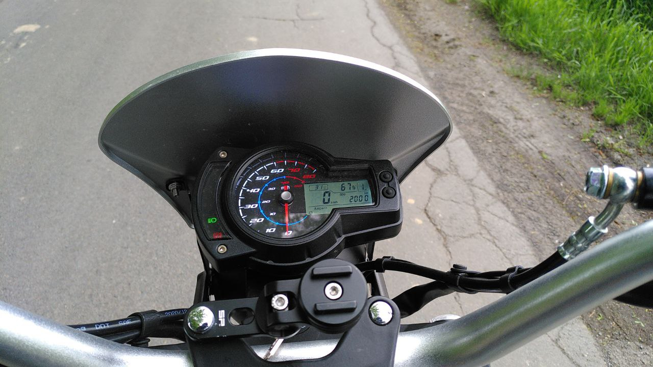 Als HMI bekommt man einen Tacho in analog und einen Tacho in digital! Man brauchts nicht wirklich doppelt, aber hübsch sieht es aus. Das Display enthält außerdem die Akku-Temperatur, Ladestand, Odometer und Amperemeter(?). Am unteren Displayrand wird in 5A-Blöcken angegeben, welche Stromstärke der Akku gerade abgibt. Maximum sind 60A oder 1.5C. Ergibt das dann wohl eine Spitzenleistung von 48V*60A=2880W? Auf der linken Seite werden Abblend- und Fernlicht sowie Blinker angezeigt. Die Knöpfe rechts, ähm die, tja. Die braucht man nicht :lol: damit wird zwischen Kilometer und Meilen umgestellt glaub ich, deshalb verwende ich sie nie. Da muss ich noch mal reingucken.