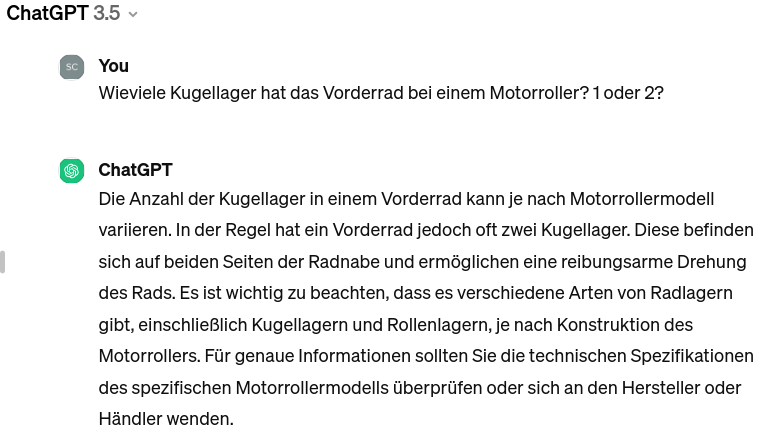 Bei genauerer Betrachtung des gelieferten Kugellagers erscheint mir dies durchaus plausibel, weil es mit ca. 1 cm sehr schmal ist. Ebenso ist ChatGPT der Meinung, dass im vorderen Radlauf 2 Stück verbaut sind.