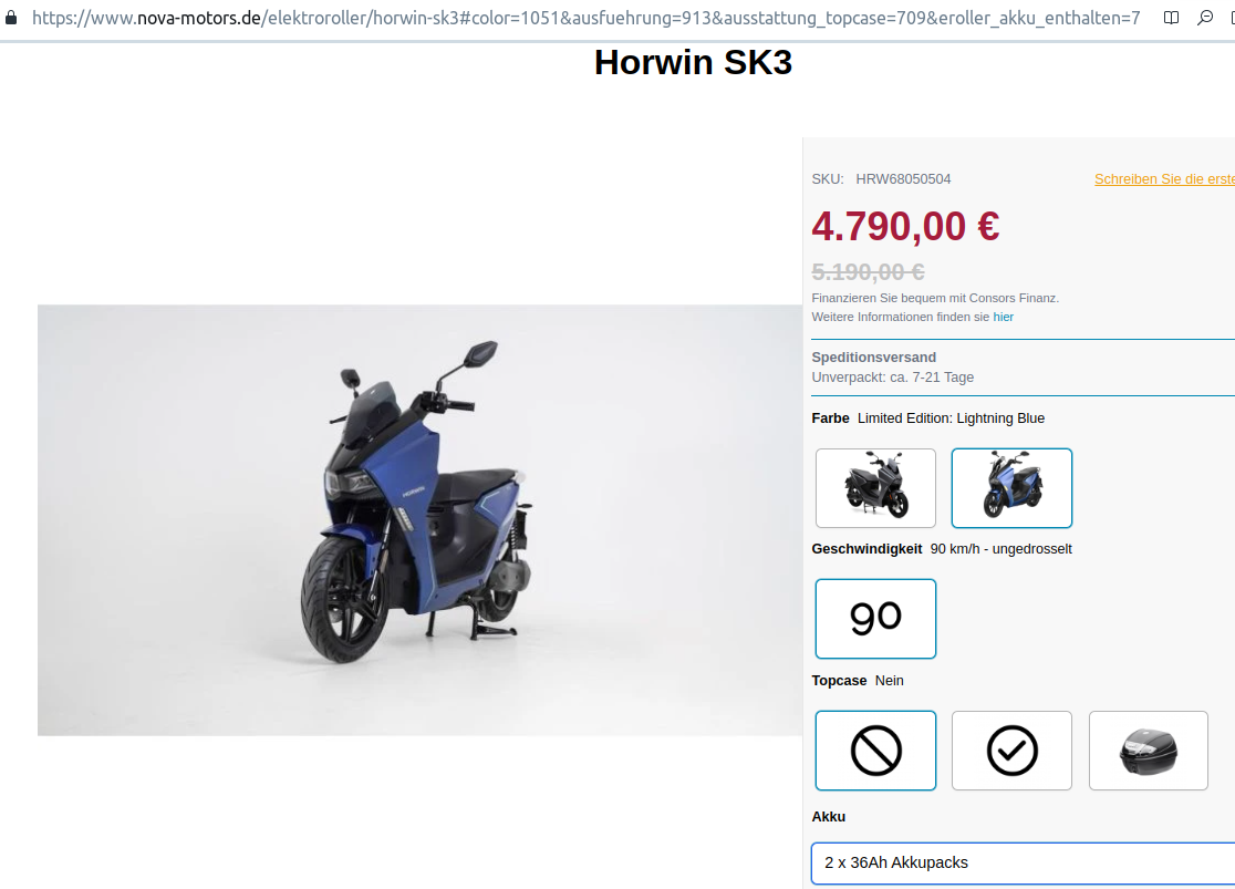 Horwin SK3:		     5.390 € (unverändert),   90 km/h, 6,3 kW, 2 Akkus 72V/36Ah = 5184 Wh, 14-Zoll Reifen, K* RE*