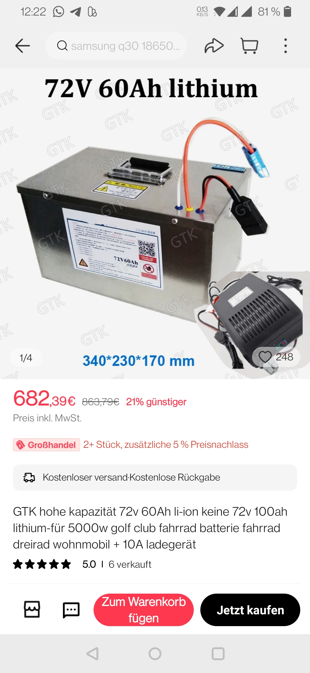 Beim Händler aus Deutschland teurer und momentan nicht lieferbar: https://www.tzipower.de/60V-30AH-Li-ion ... 4-327.html