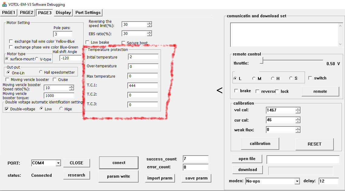 Die möglichen Einstellungen zum Temperatursensor beziehen sich aus meiner Sicht auf den verwendeten Sensor und QS-Motors (Partner mit VOTOL im SIAECOSYS-Verbund) verbaut in den Motoren den für 122°C (KTY83_122). (Habe die Funktion aber nicht aktiv)