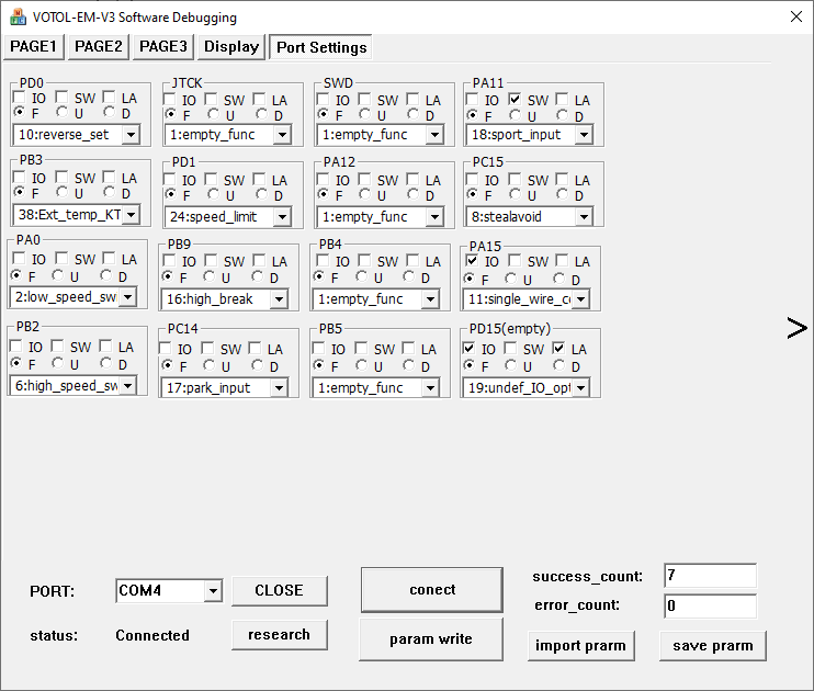 Richtig, der Kommunikationsport zum Tachodisplay (Umschaltbar LIN-Protokoll / Hall-Simulation) liegt natürlich auch an fester Stelle (bei mir PB9) nur eben beim EM150SP mit anderem Stecker anders, als beim EM200SP (der meiner Anleitung aber nicht beschrieben ist) wo es wohl PA15 ist.