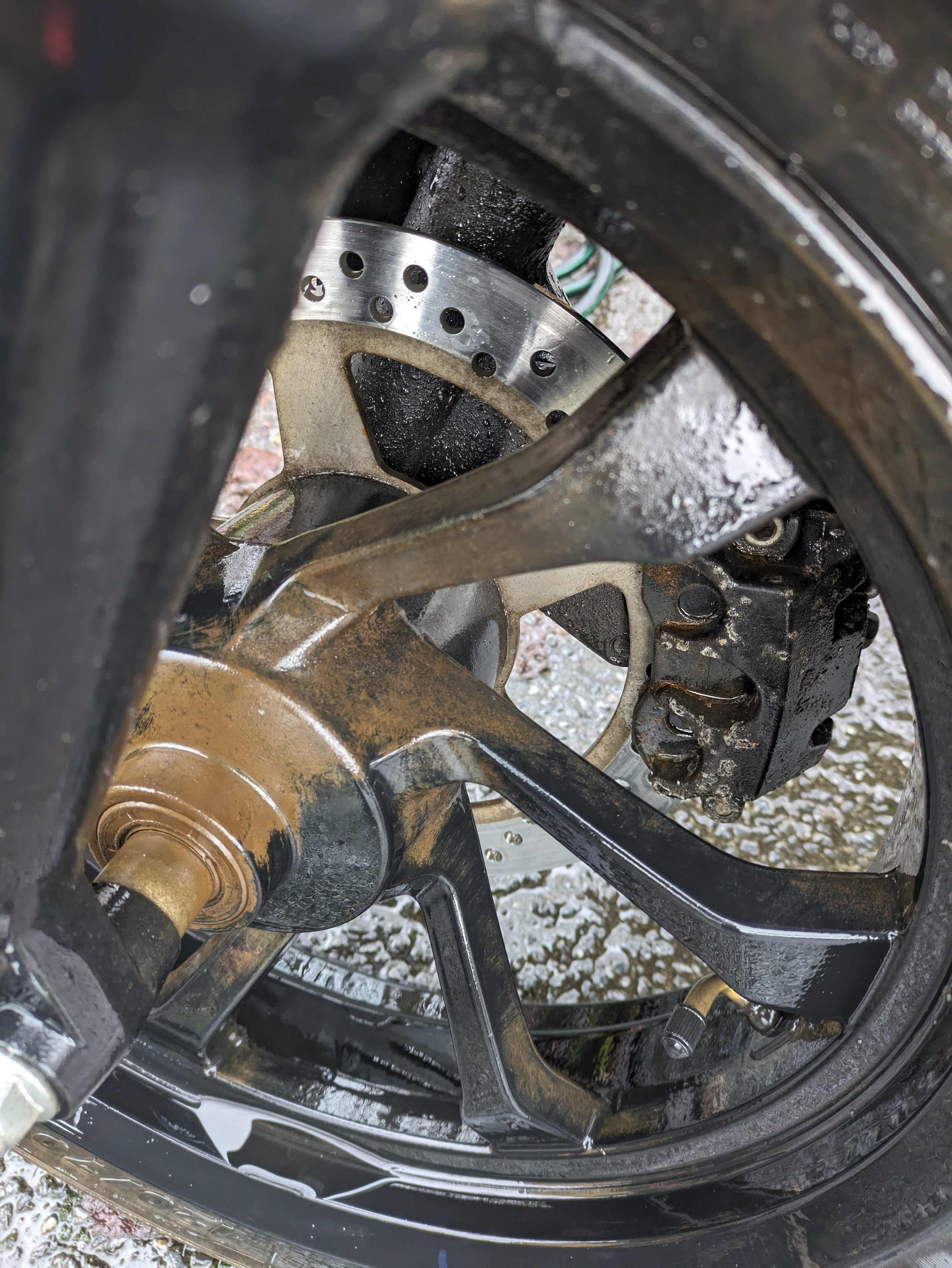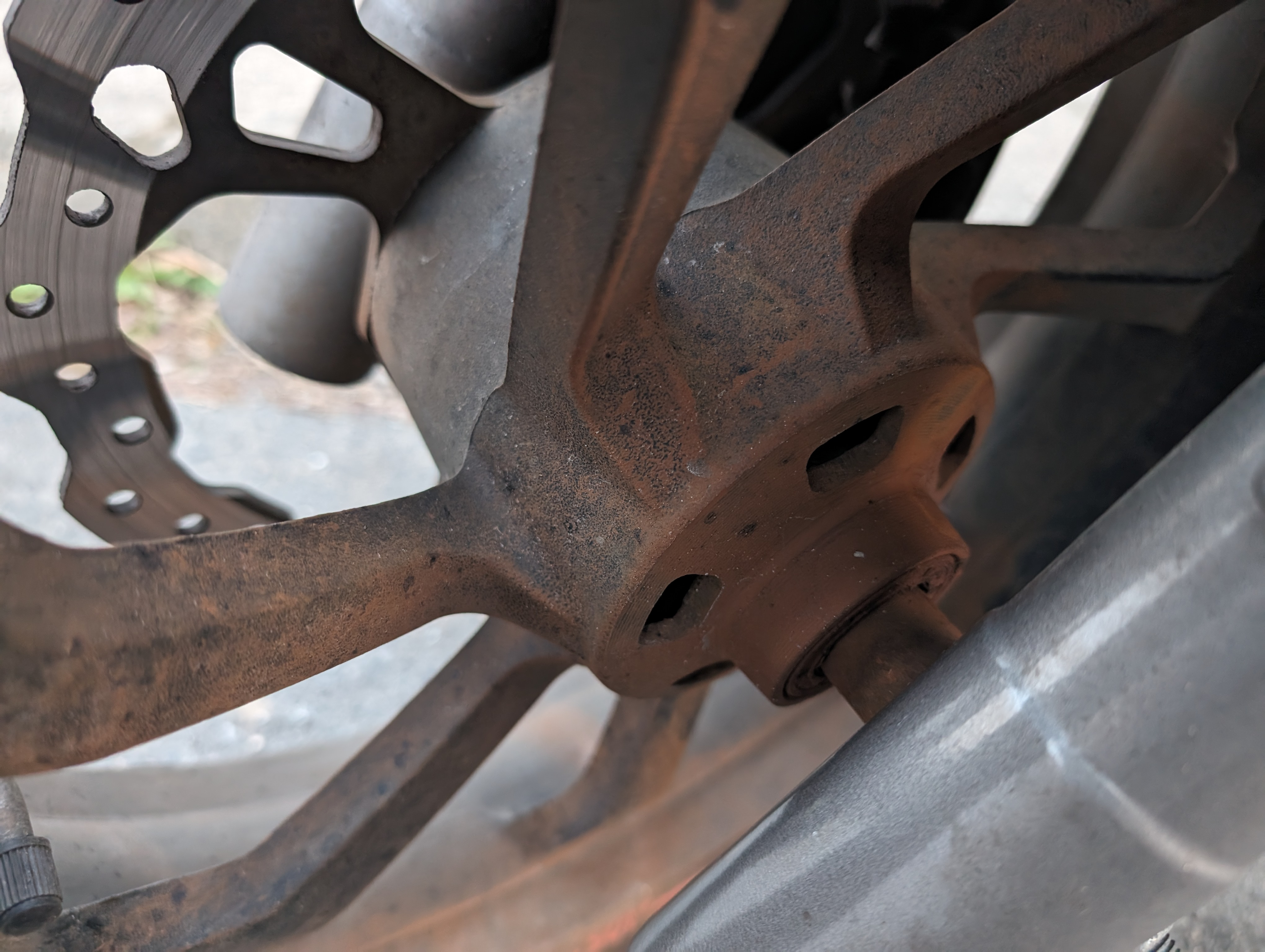 Der Kollege im Suzuki Autohaus meinte, das dies auf einen Schaden im Lager hindeuten könnte. Da die Gabel selbst und das Rad Alu seien und nicht so rosten sollten.
