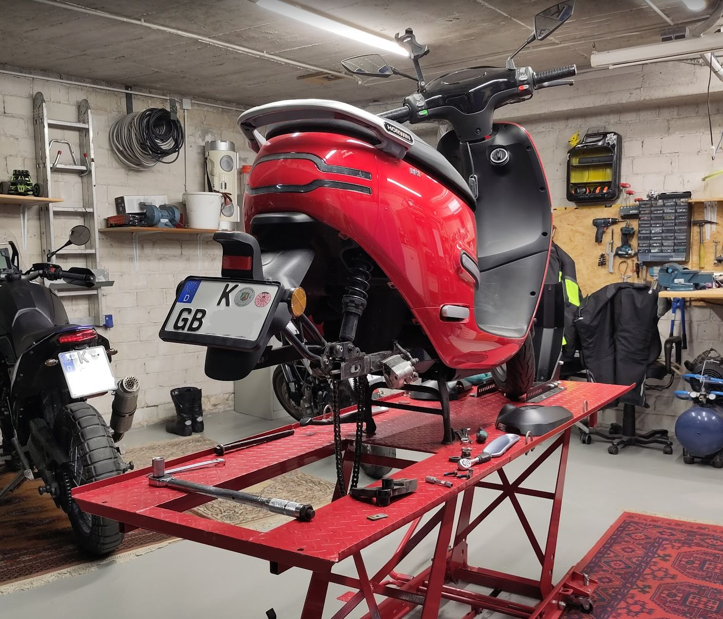 Die wichtigste zu klärende Frage ist zu Beginn: wie lagere ich den Roller ohne Hinterrad sicher? Dafür habe ich mir bei Louis einen Universal-Motorradheber zugelegt. Die 25,- Euro sind gut angelegt, das Teil in wenigen Minuten montiert, und das Motorrad - zugegebenermaßen entgegen den ausdrücklichen Sicherheitshinweisen im Handbuch