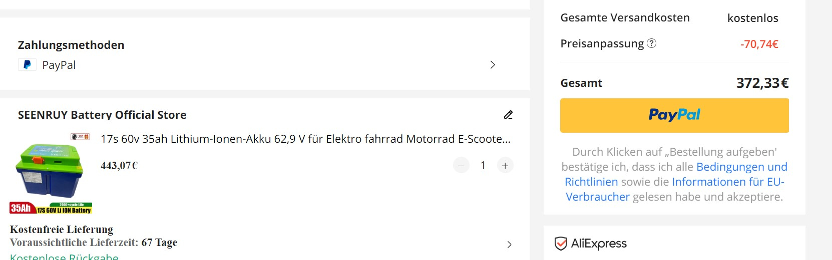 Ein Händler in D liefert die dort vorrätigen China-Akkus schneller und mit weniger Risiko, will seine Arbeit aber natürlich entlohnt sehen: https://www.tzipower.de/60V-30AH-Li-ion ... 2-204.html