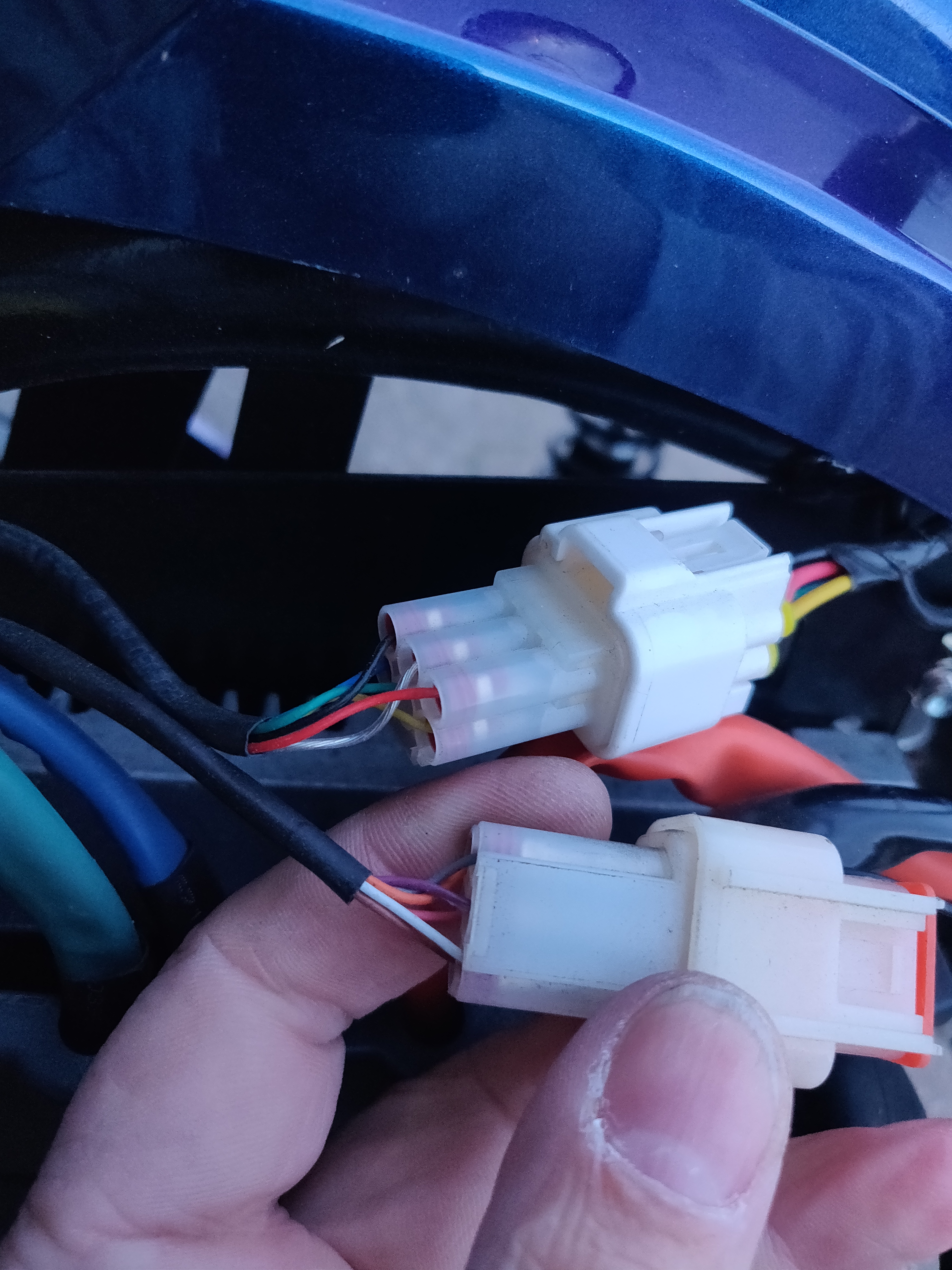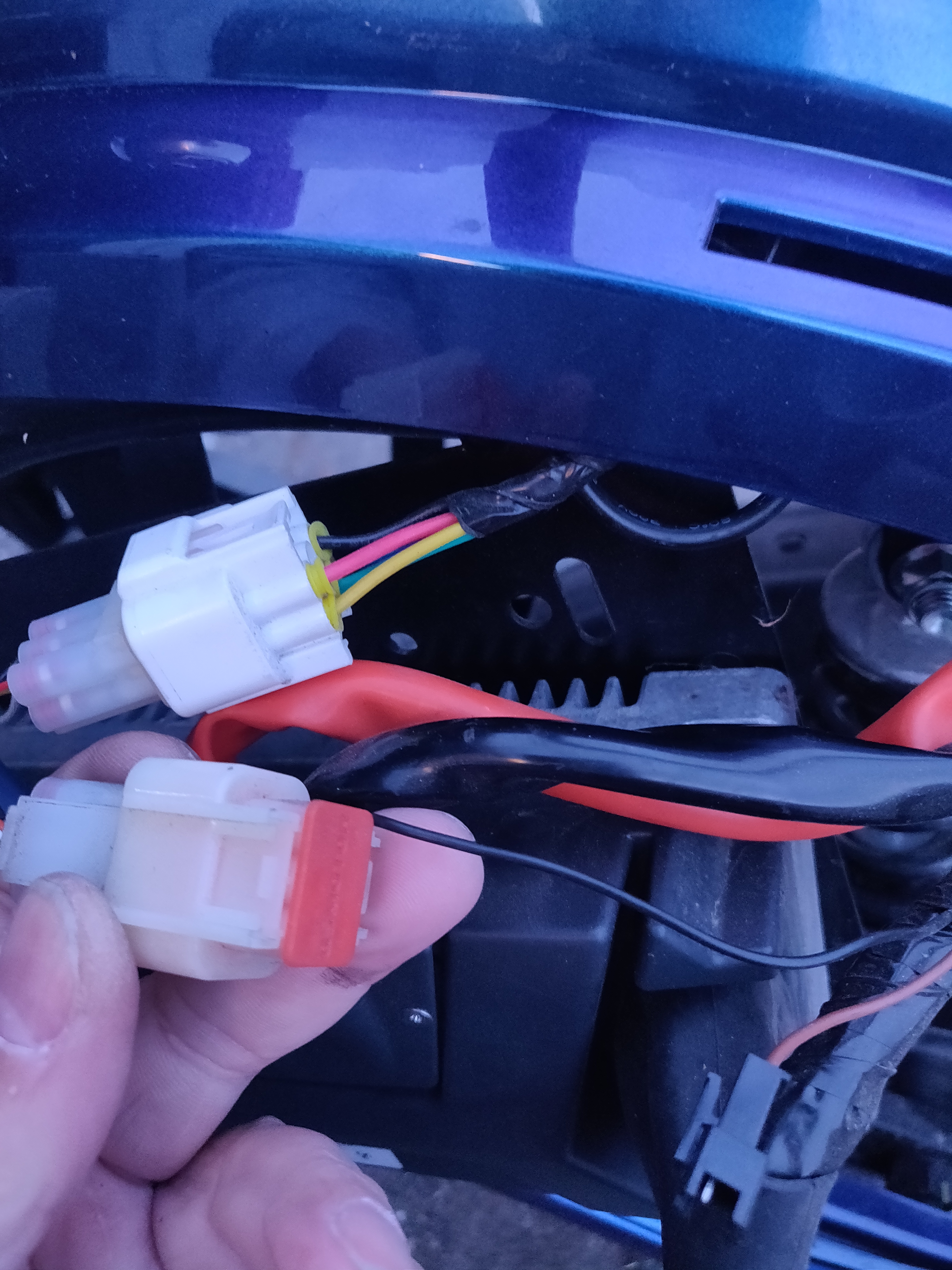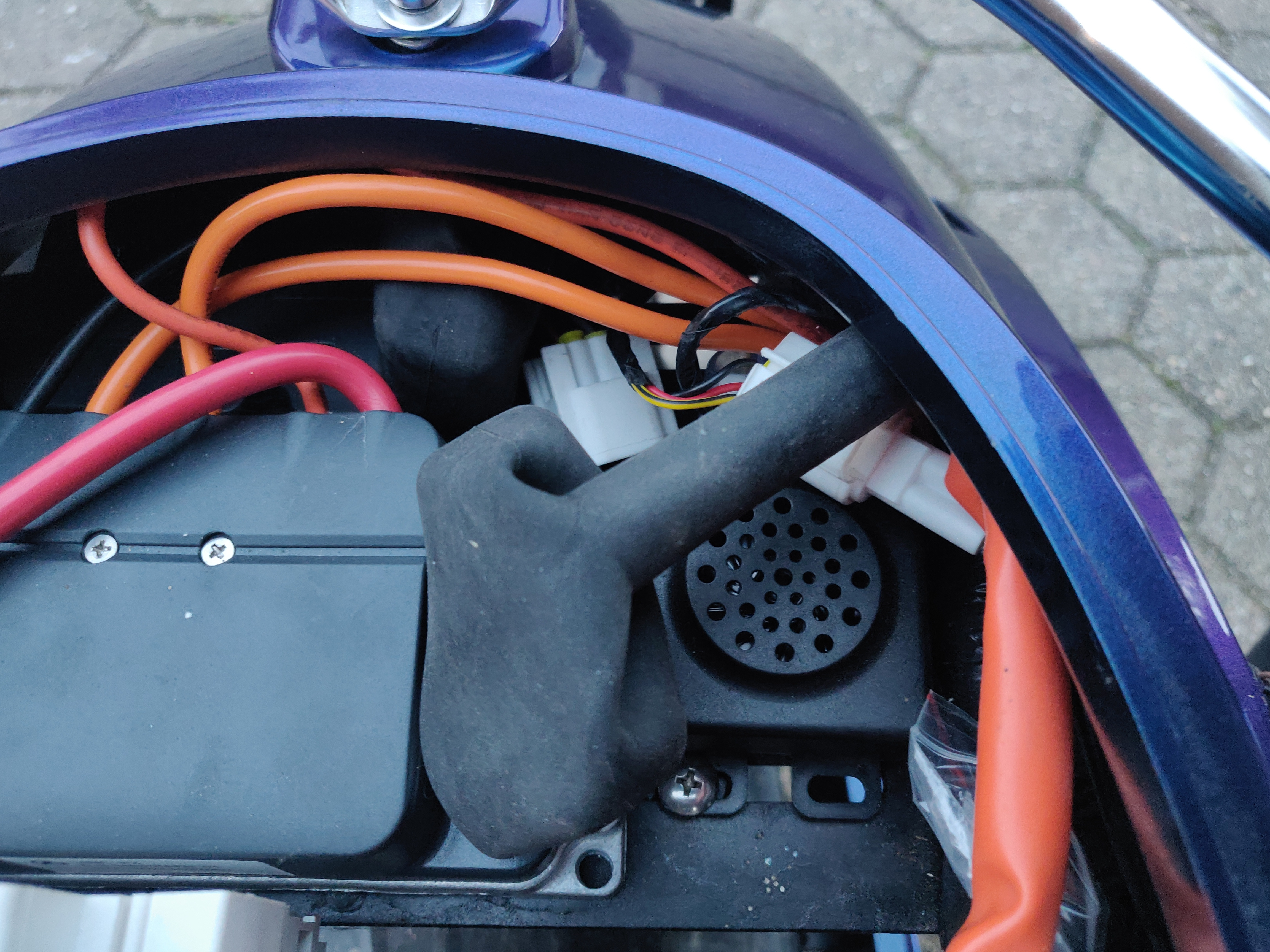 Im Roller sind diverse Geräte verbaut, da muss ich noch ein wenig Forschung betreiben. Oben hinten sitzt die Sirene der Alarmanlage, ein kleiner Kasten mit orangen Kabeln und noch ein kleiner Kasten. Da kann von unten gut Dreck/ Wasser ran, da gibt es gleich noch ein passende Verkleidung.