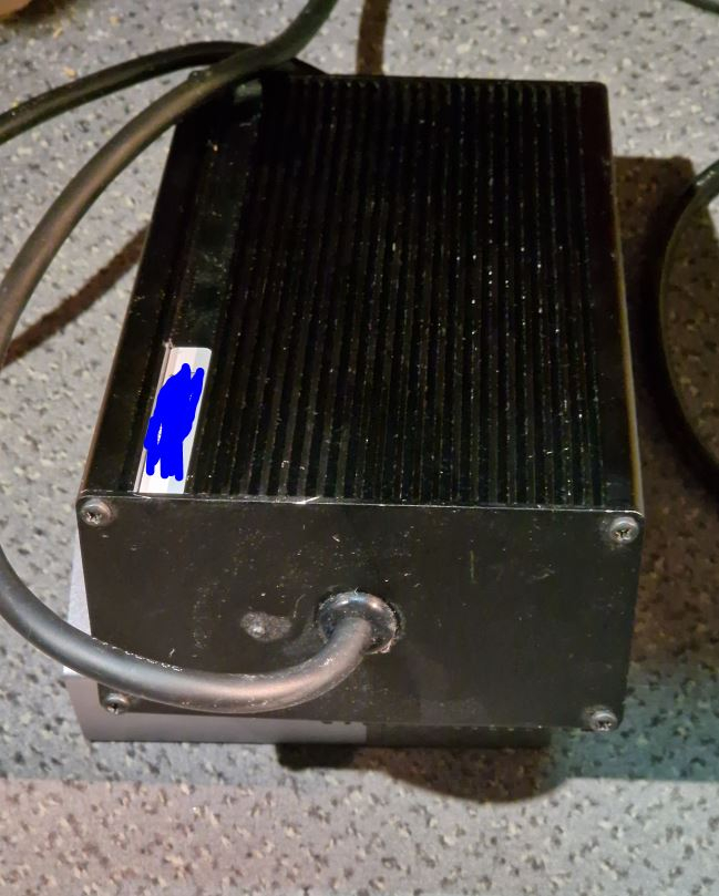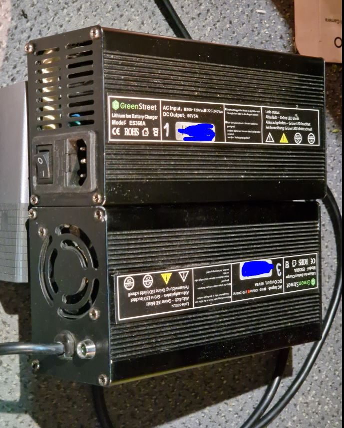Modellnummer des alten, was oft kaputtgeht: ES360A Die Effizienz des Ladegerätes ist sehr schlecht: Das Ladegerät hat eine Besonderheit: Es startet mit 100-150W (Netzteileingang, 230V 100-114W in den Akku) Initialleistung je nach Akkuspannung, dann macht es nach 10 Sekunden Klack und es schaltet die 5A mit etwa 366-390V je nach Akkuspannung durch.