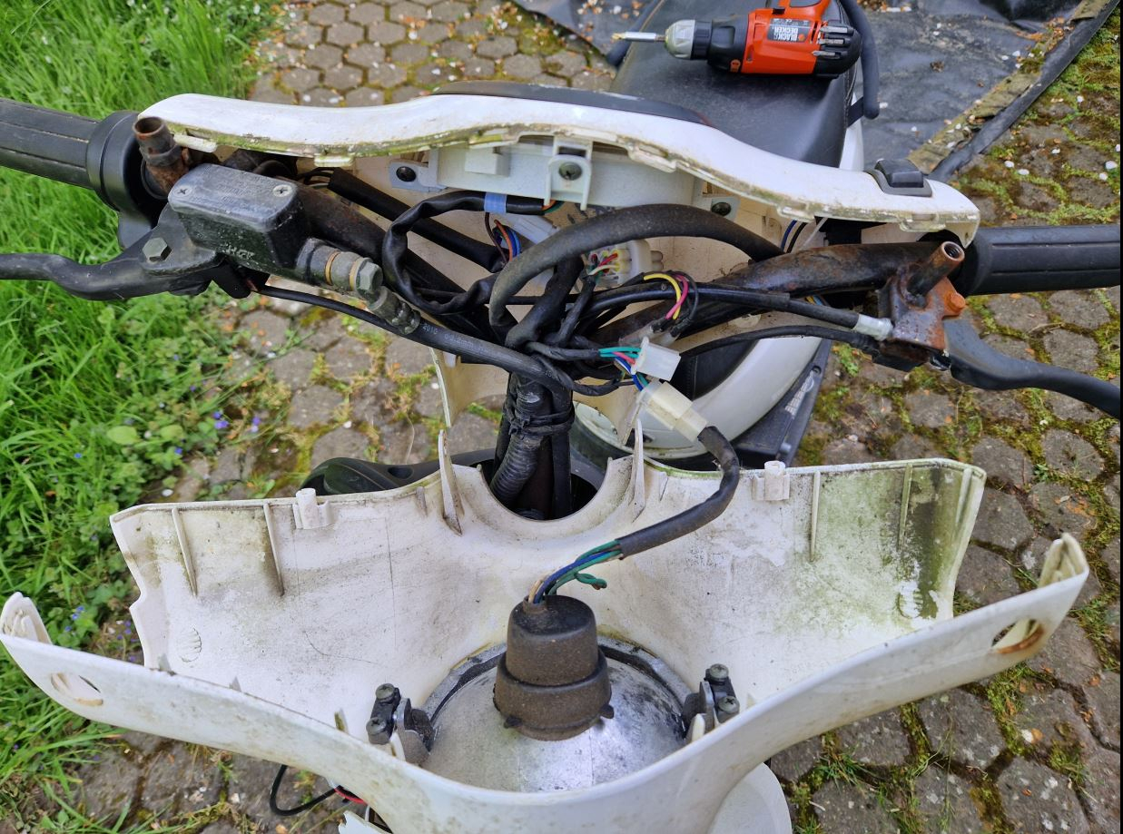 Die Lenkerverkleidung geht schnell ab, wenn man die Schrauben löst und oben ausclipst. Wie man sient läuft das Wasser durch die Spiegellöcher und auch hier rostet es. Vielleicht kann man die Löcher mit einrr großen Dichtung schließen.