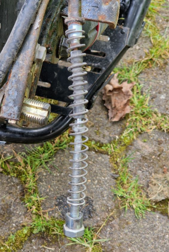 Vor der Schwinge muss der Hauptständer raus. Der hat keine vernümftige Sicherung gegen Lösen, drehte sich mit. Jetzt kann man auch den kleinen Ständer demontieren. Auch dieser hat zum Schutz einen Mikroschalter, der den Motor stoppt, damit man nicht mit ausgefahrenem Ständer losfährt. Wenn der Festsitzt, geht der Motor nicht. (Warnsymbol im Display) Komischerweise sieht die Feder von diesem Ständer viel besser aus.
