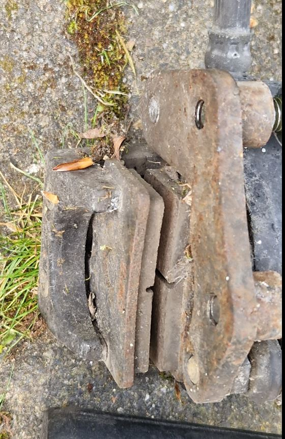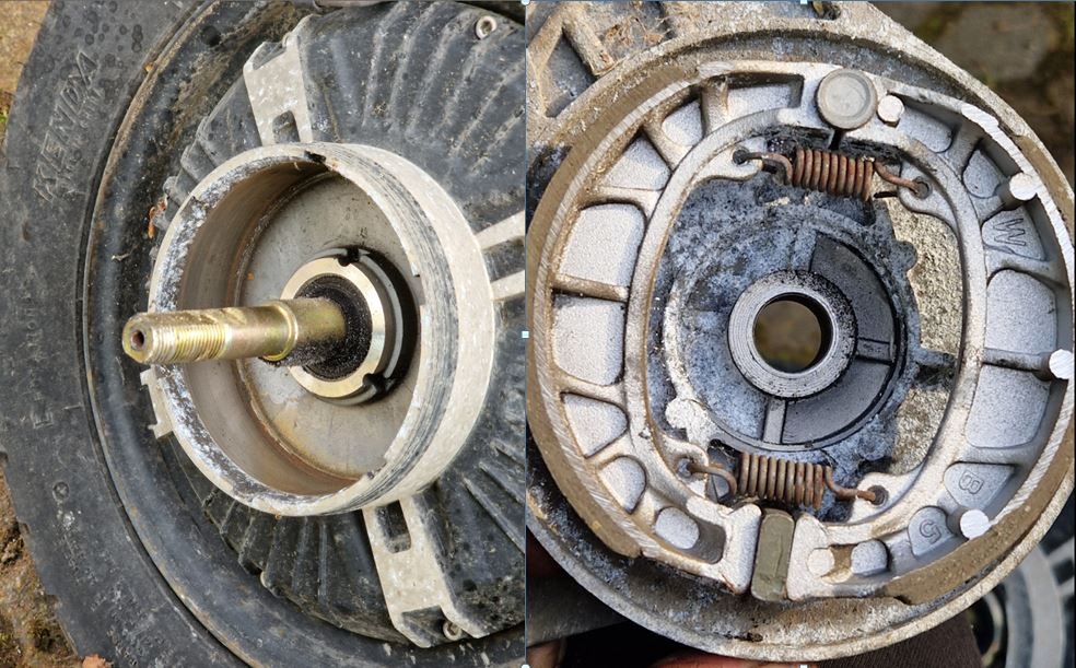 Die linke Bremse (Hinterrad, Trommelbremse, Seilzug) ist festgeschweisst, die Rechte (Vorderrad, hydraulisch) kann man demontieren.