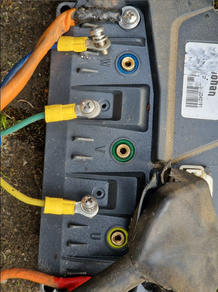 Die Motorleistungkabel haben keine Stecker/Kupplung, sindern sind direkt am Motortreiber festgeschraubt: Hier kann man nix falsch anschließen, alles schön farbig kodiert: Nachdme man die Gelöst hat und den Stecker für die Signalleitungen vom Motot getrennt hat, kann man sich an die Schrauben machen.